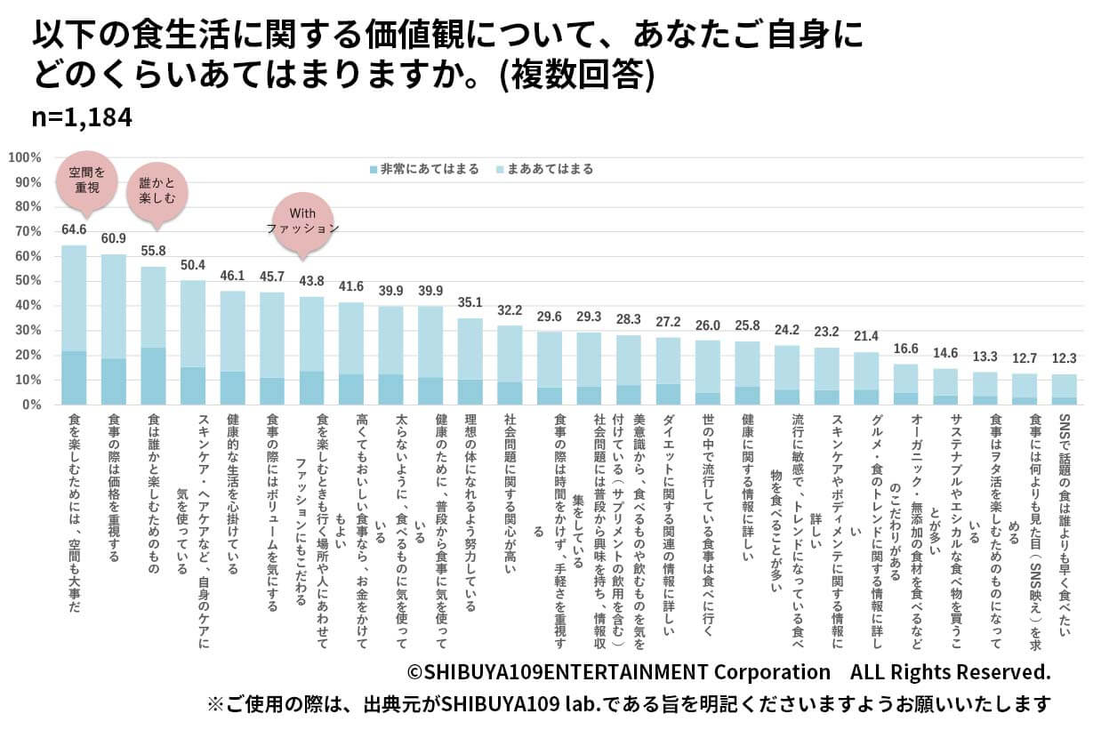 次に、食において重視している価値観を聞いたところ、「食を楽しむには、空間も大事だ(64.6%)」が最も高く、「食は誰かと楽しむためのもの(55.8%)」、「食を楽しむときも行く場所や人にあわせてファッションにもこだわる(43.8%)」などがあがる結果となりました。