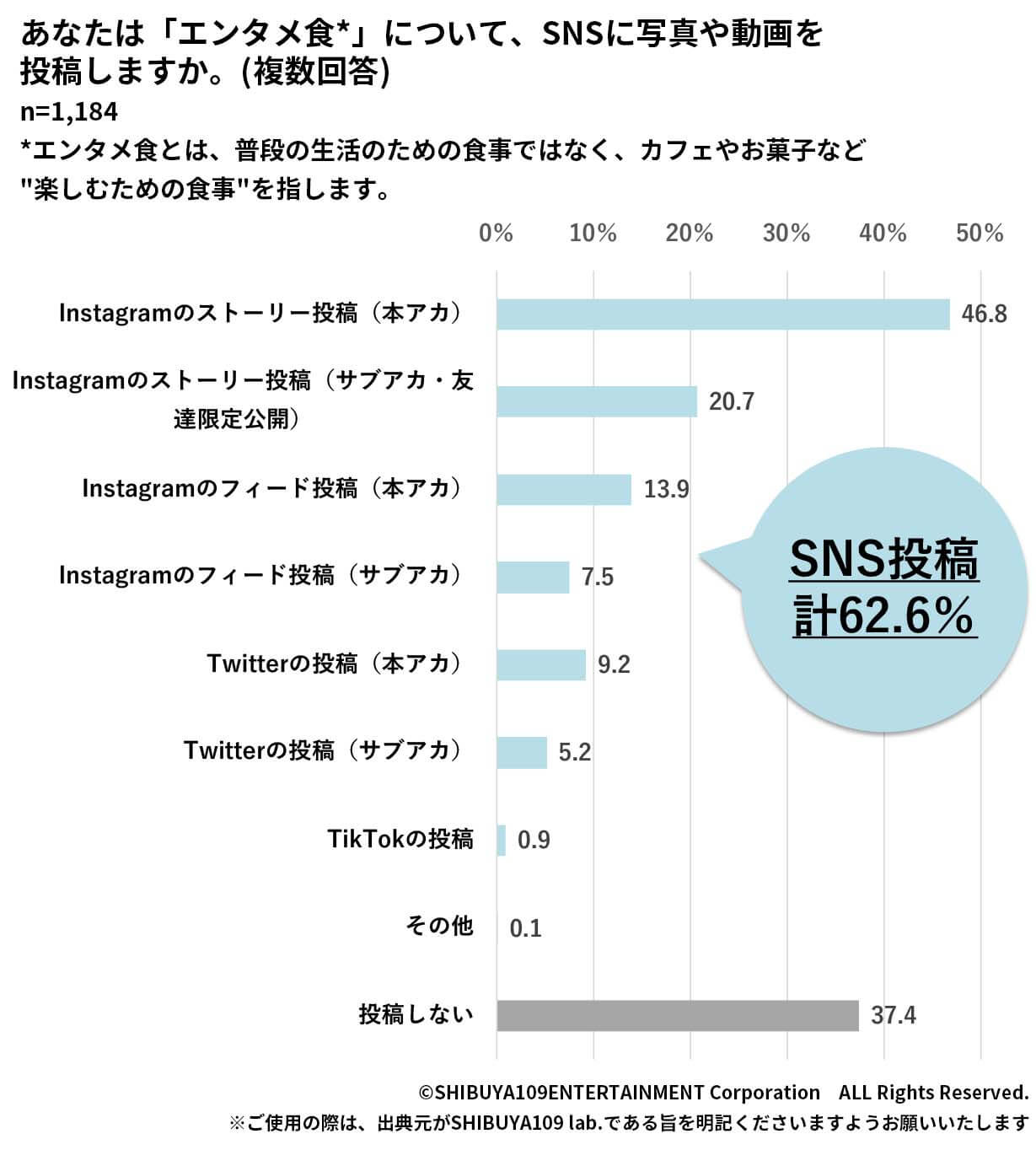 また、Z世代に食に関するSNSの投稿方法を聞いたところ、「投稿しない」と回答した人は37.4%となり、60%以上がSNSに投稿していることが分かりました。