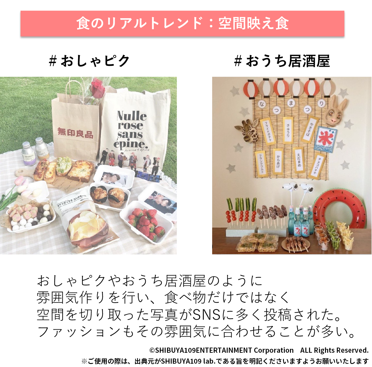 今まさにZ世代の中で広くトレンドになっている食です。「おしゃピク」「おうち居酒屋」など、空間を重視し、準備からその後のSNS投稿まで楽しめるものが多くなっています。