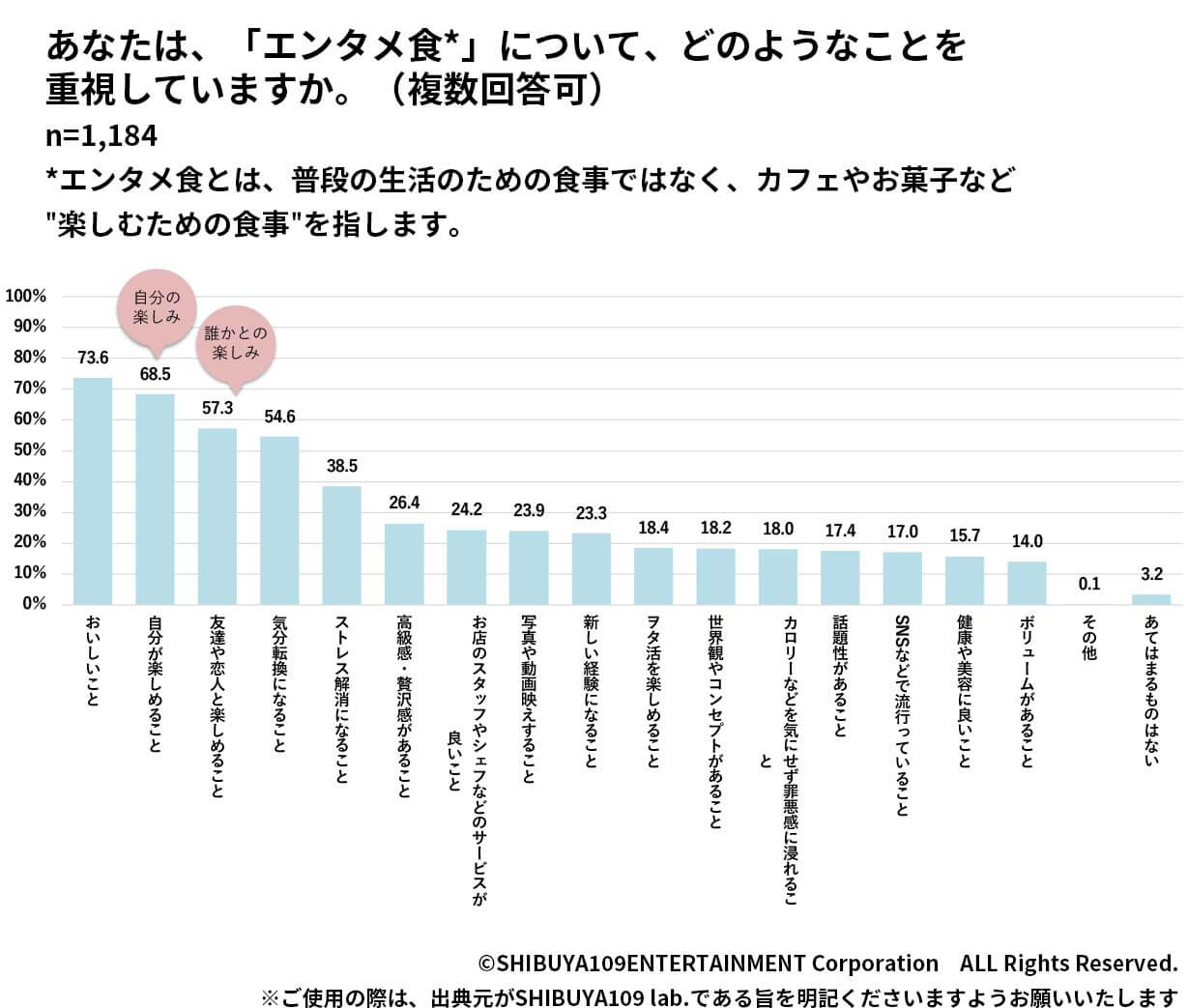 次に、エンタメ食において重視する点を聞いたところ、「おいしいこと(73.6%)」に続き、「自分が楽しめること(68.5%)」、「友達や恋人と楽しめること(57.3%)」、「気分転換になること(54.6%)」という結果となりました。味だけではなく、自分や一緒にいる人との時間を充実させられることを食に求めており、食を通してコミュニケーションを生み出すことが気分転換にも繋がっていることが分かります。