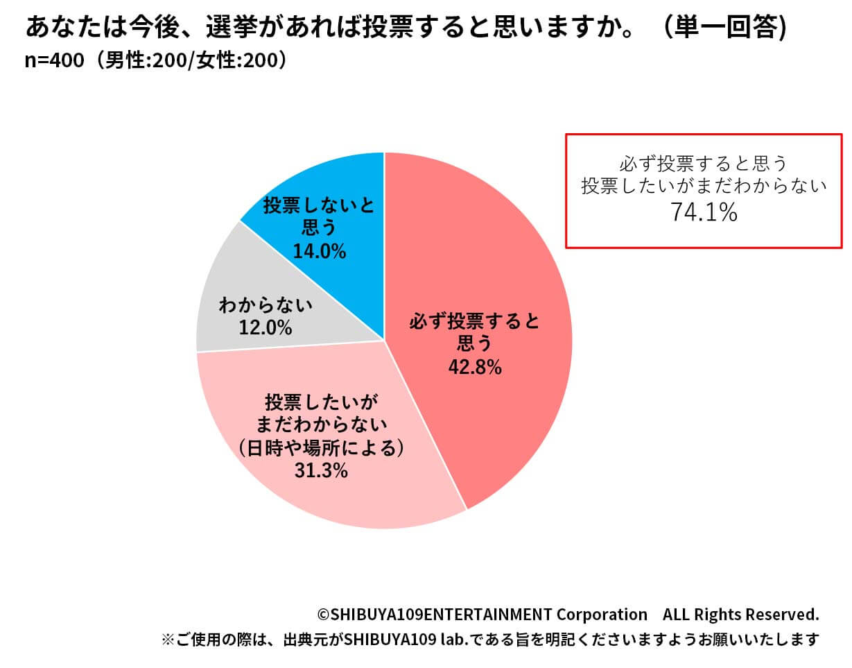 まず「今後、選挙があれば投票すると思いますか」と聞いてみたところ、「必ず投票すると思う(42.8%)」「投票したいがまだわからない(日時や場所による)(31.8%)」という回答が得られ、約7割以上のZ世代に投票意向があることがわかっています。