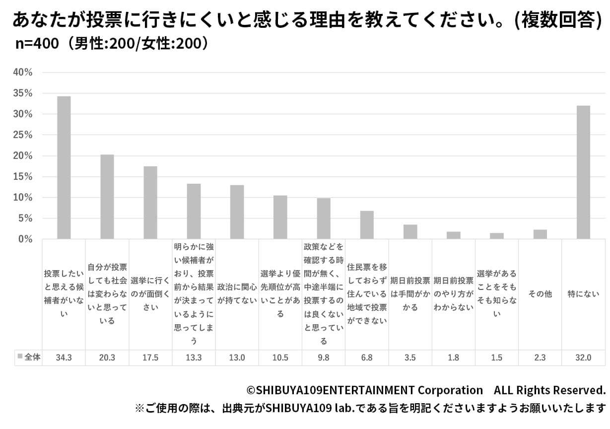 一方で、投票に行きにくいと感じる理由を聞いてみると、「投票したいと思える候補者がいない(34.3%)」「自分が投票しても社会は変わらないと思っている(20.3%)」が回答数として多く、政治に対する期待感の低さが投票のハードルに繋がっているようです。