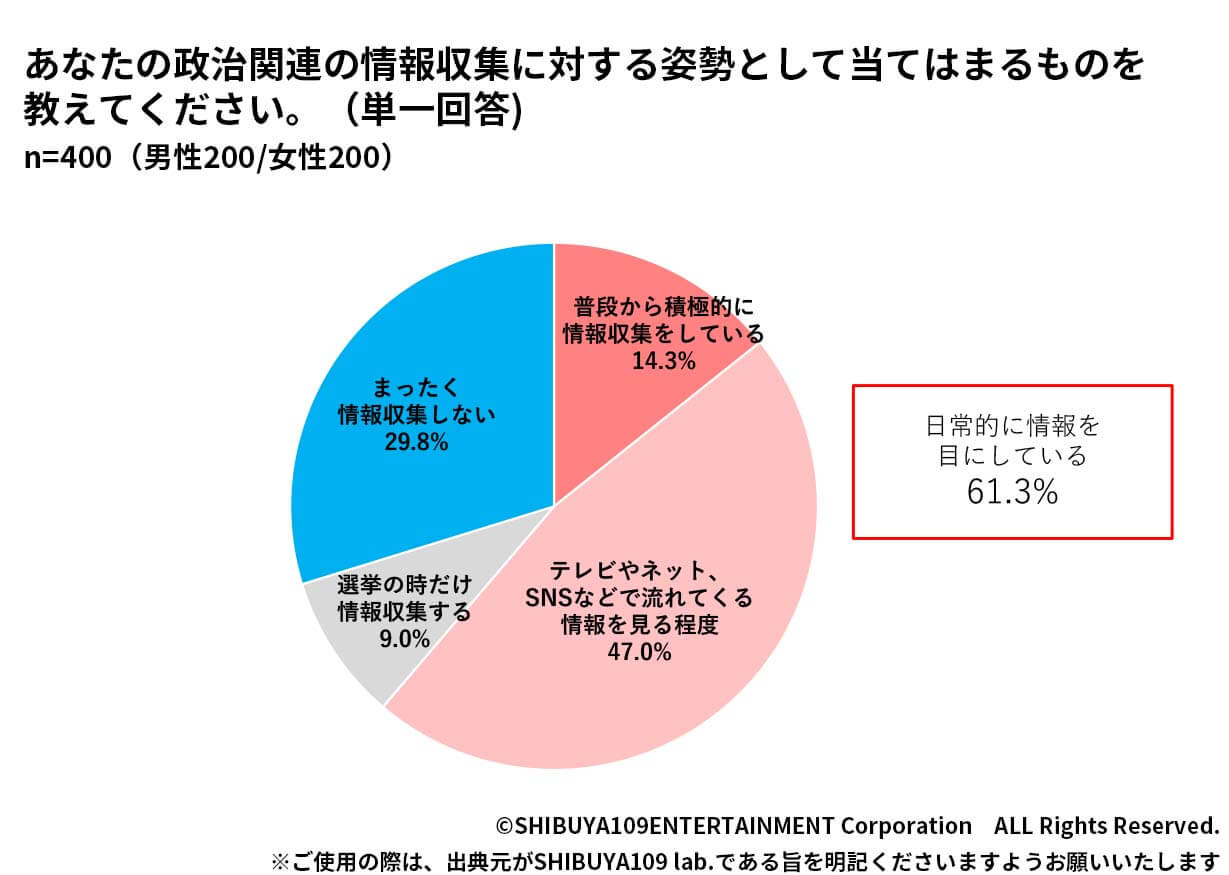 次に、政治関連の情報収集実態について聞きました。選挙前だけでなく、日常の中で政治関連の情報を目にしているという回答者は61.3%となり、半数以上のZ世代が日常的に政治に関する情報に触れていることがわかります。