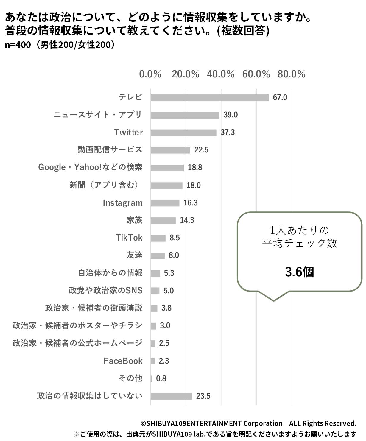普段の政治に関する情報収集の媒体は「テレビ(67.0%)」「ニュースサイト・アプリ(39.0%)」「Twitter(37.3%)」と、マスメディアも活用しながら情報収集しています。また、1人あたりの平均チェック数は3.6個となり、複数のメディアから情報を収集していることがわかります。グループインタビューで聞いてみると「食事の時にテレビをつけて、特に番組を選んだりせず、その時に放送しているニュースを見ている」「テレビの情報も見た上で、皆の意見がどうなのかをTwitterで見る」など、情報源を使い分けながら収集していることがわかります。