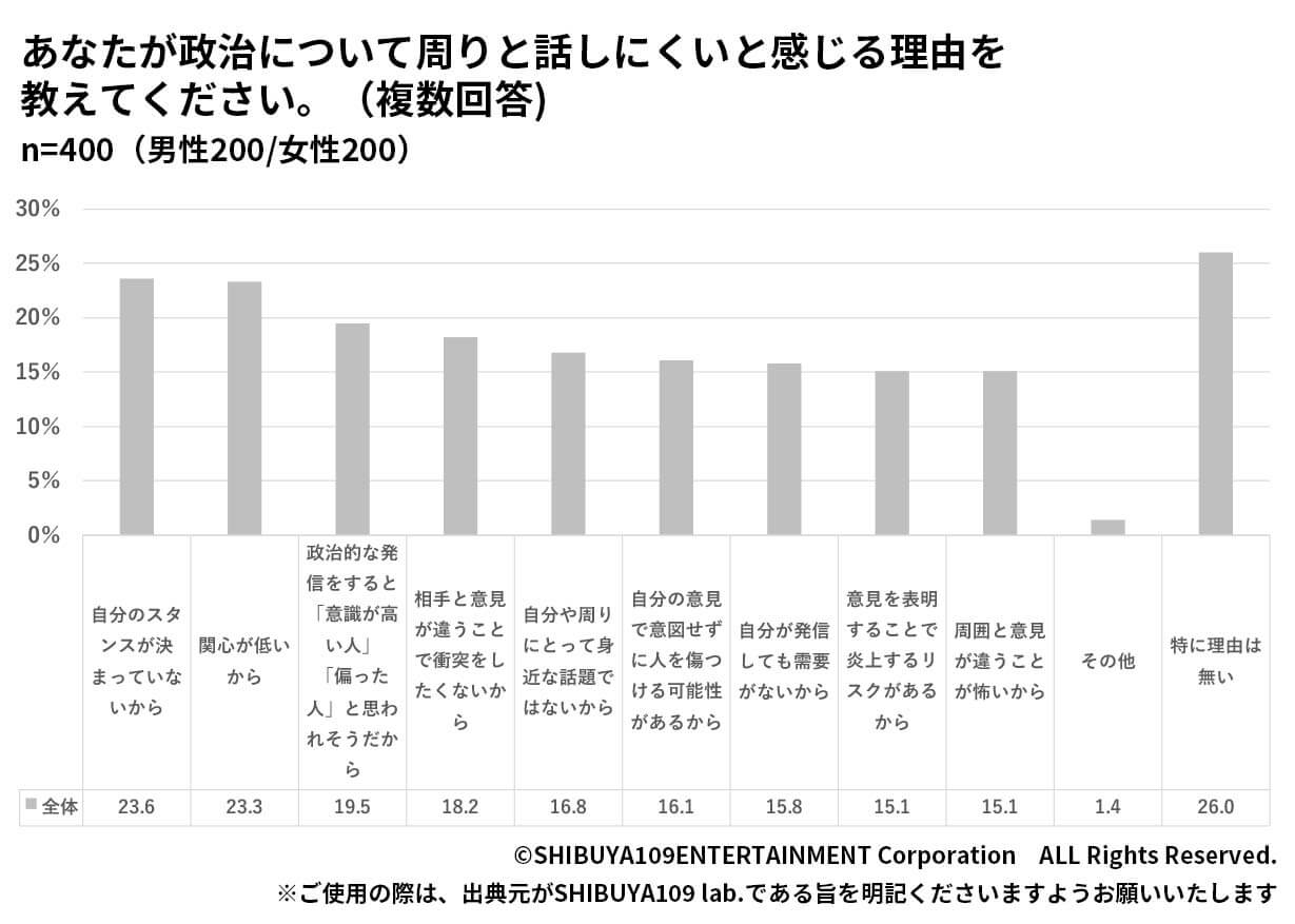 政治の話題が話しにくい理由としては、全体では「自分のスタンスが決まっていないから(23.6%)」が最も多い回答となりました。グループインタビューでは、特定の問題に対して「どちらが悪いと言い切るのは難しい。私たちが目にするニュースも何らかの偏りがあると思うので、そこから一概に善悪を決めつけることはできない」といった声もあり、多様な意見に耳を傾けているからこそ、白黒つけることを避ける傾向が見られました。