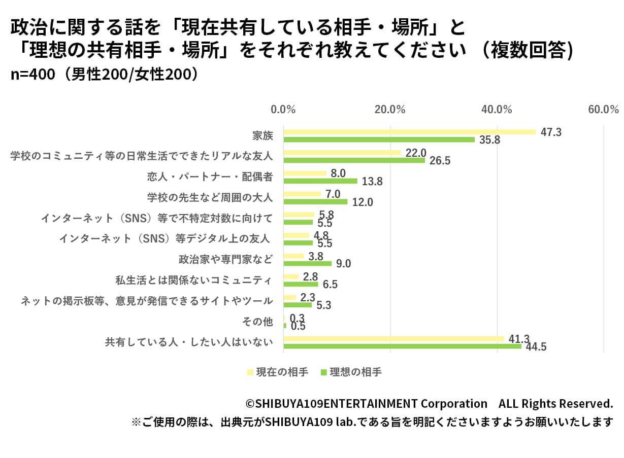 政治の話を共有する相手についても、「家族(47.3%)」「リアルな友人(22.0%)」の回答数が多くなるなど、政治は親しい間柄で話し合うトピックになっているようです。特に政治に関心のある層を集めたグループインタビューでは、「家族とニュースを見ながら政治の話をする」という声も複数聞かれました。