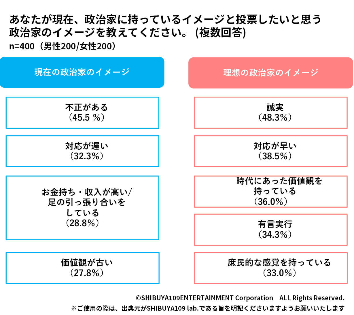 一方で、「理想の政治家のイメージ」を聞くと、「誠実(48.3%)」「対応が早い(38.5%)」などが回答数で上位になっており、現在のイメージと真逆になっていることがわかりました。SHIBUYA109 lab.の過去調査にて、Z世代のSNS活用について調査した際、インフルエンサーを支持する理由として、丁寧な対応や誠実さが挙げられていました。これらの結果は、Z世代が信用に足る人物だと判断する上で”誠実さ”を重要視していることを示しています。