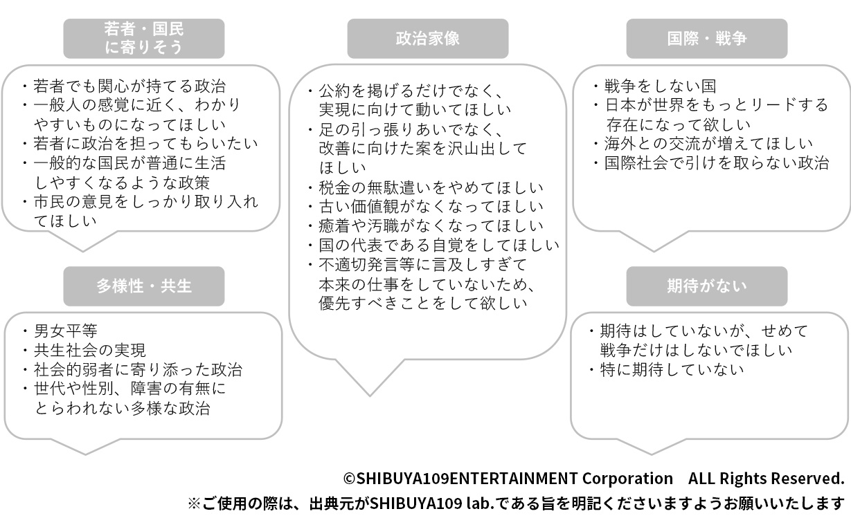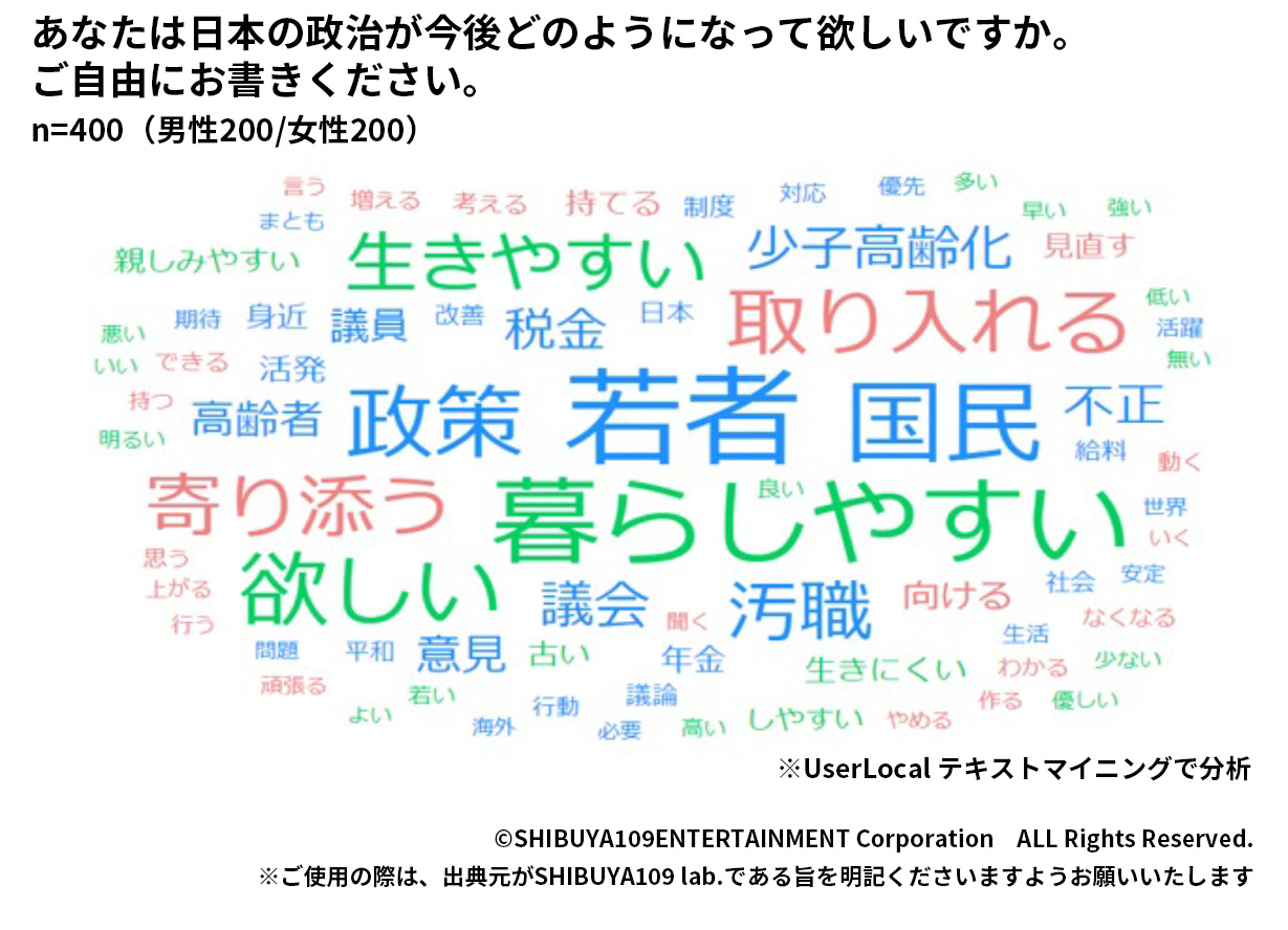 さらに、理想の政治について自由回答で聞いてみると、「若者・少数派を含む国民に寄り添って欲しい」という意見が多く、「暮らしやすい」「寄り添う」「生きやすい」など、生活に根付いたキーワードが散見されました。