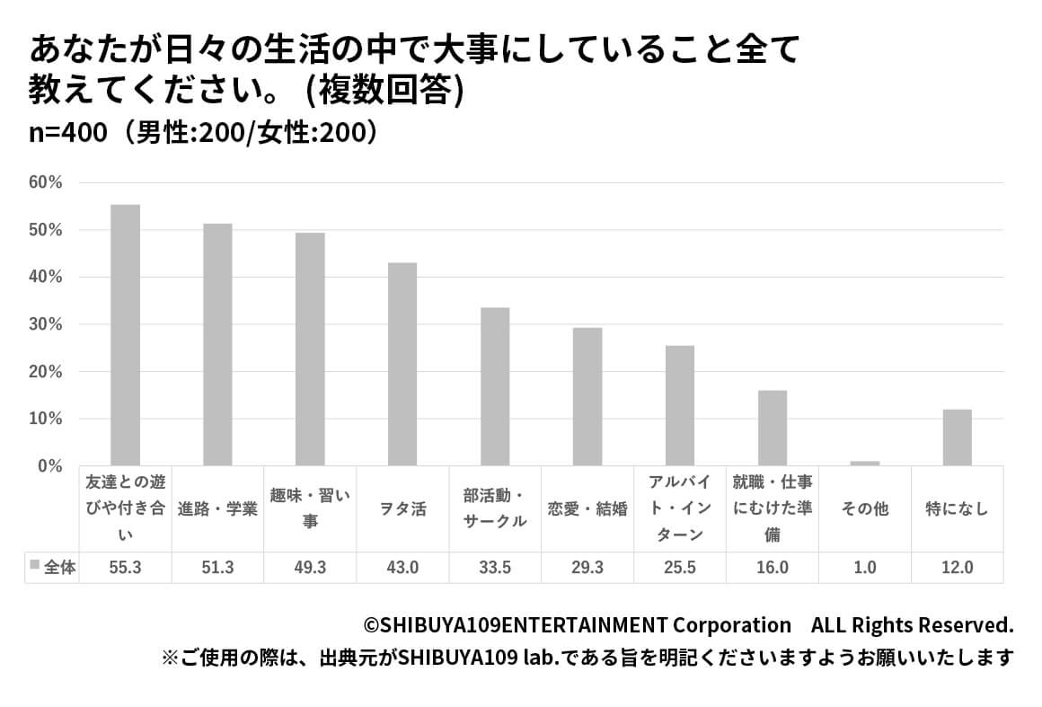 さらに、日常生活の中で大事にしていることを見てみると、「友達との遊びや付き合い」(55.3%)「進路・学業」(51.3%)「趣味・習い事」(49.3%)「ヲタ活」(43.0%)「部活動・サークル」(33.5%)「恋愛・結婚」(29.3%) となり、Z世代は日常的に趣味や学業、友だちとの遊びなど、多くのことを楽しんでおり、恋愛はあくまでその中のひとつとして捉えていると考えられます。