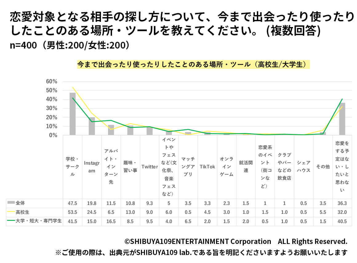 あくまで人生の楽しみの1つとして恋愛を楽しむZ世代。そんなZ世代はどのような恋愛を楽しんでいるのでしょうか。恋愛対象になる相手を探すにあたって、出会ったり使ったことのある場所・ツールを見てみると、「学校・サークル」(47.5%)「Instagram」(19.8%)「アルバイト・インターン先」(11.5%)が上位となりました。また、出会う場所、アプローチする場所に関しては、高校生は他の年代にくらべて「Instagram」の割合が高くなっています。