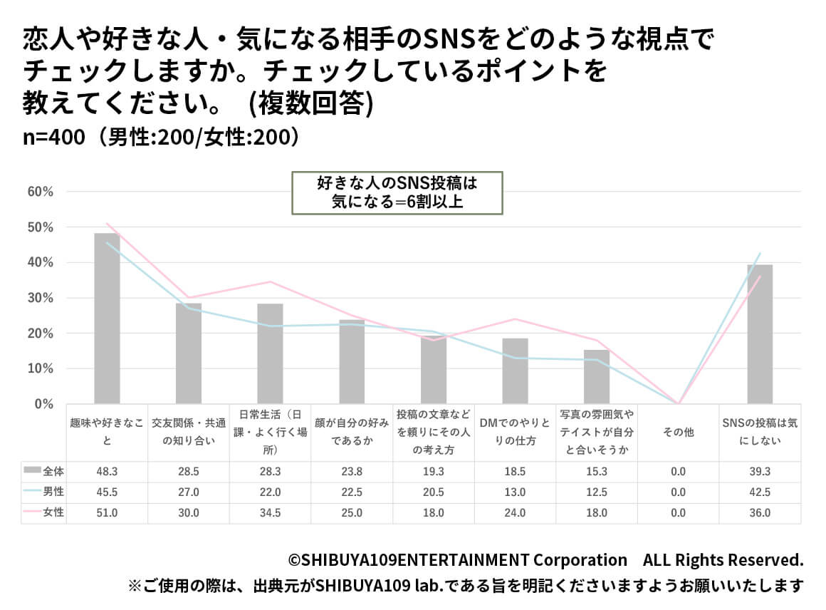 SNSでチェックする項目は、「趣味・好きなこと」(48.3%)「交友関係・共通の知り合い」(28.5%)「日常生活(日課・よく行く場所)」(28.3%)となっており、話しかけるきっかけとなる趣味を知る目的や、交友関係を把握するツールとして使われていることがわかります。
