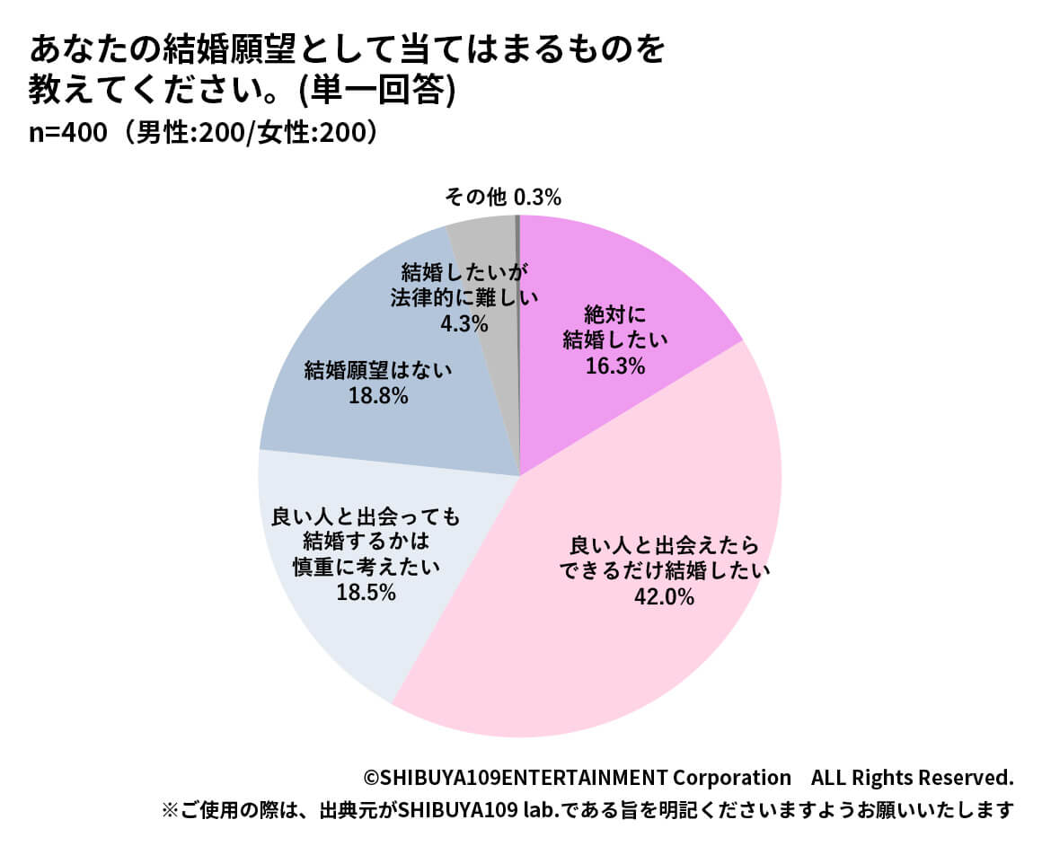 結婚願望についても触れていくと、「絶対に結婚がしたい」と回答したのが16.3%、「結婚願望はない」と回答したのが18.8%となりました。