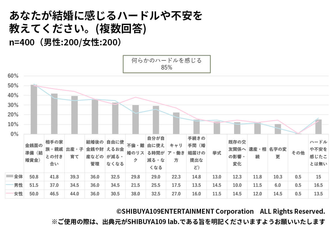 結婚に対して、何かしらのハードルを感じると答えたのは85.0%、最も多かったのは「金銭面の準備」(50.8%)となりました。実際にグループインタビューでは「社会人になってバリバリ働いて自分に使いたいし、養われたくない」「結婚は楽しそうだけど、出来ないことが増えそう。子どもが出来たら仕事も制限されるのが嫌だ」など、仕事と家庭の両立に不安を感じる意見が女性を中心に多く聞かれました。