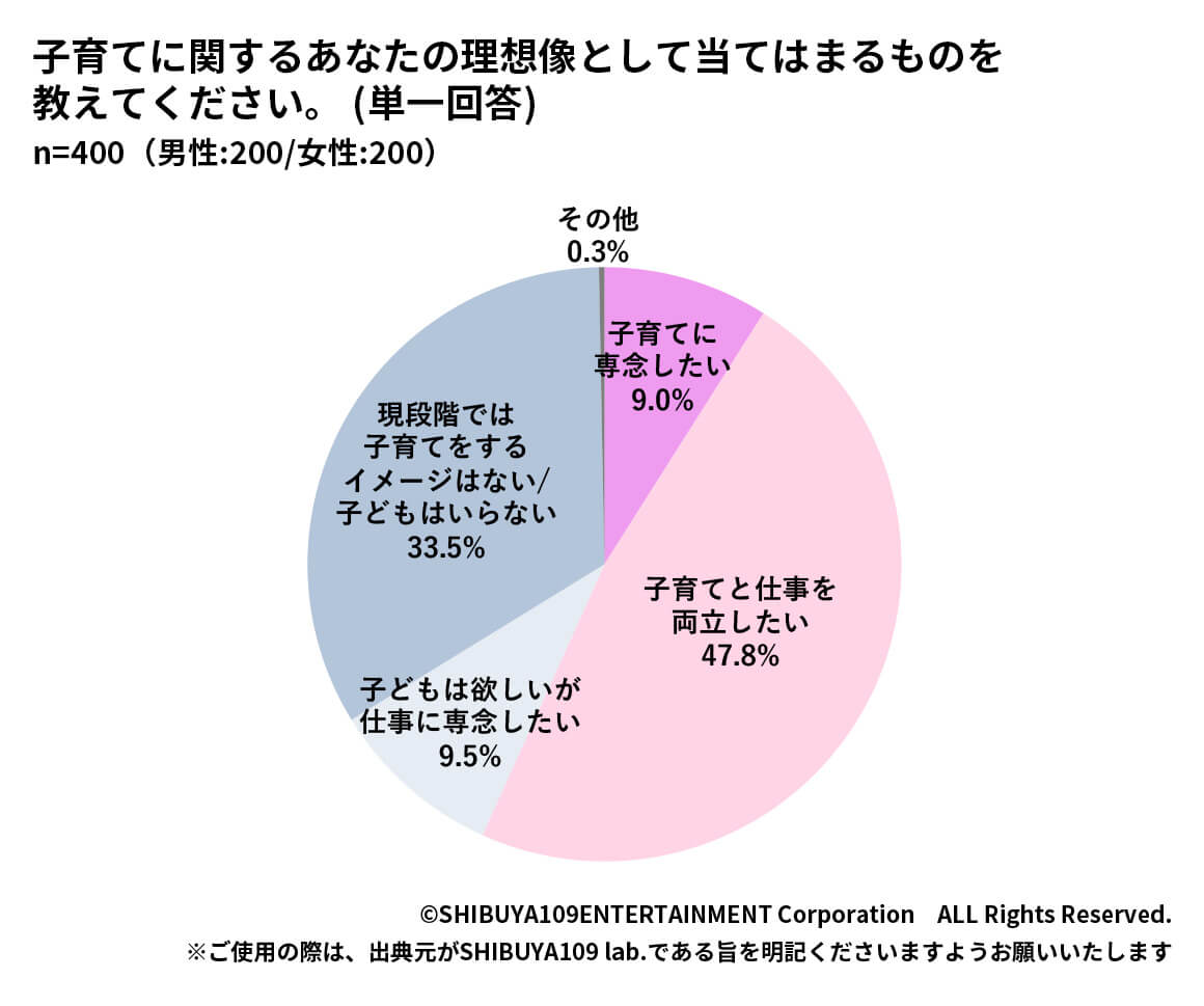 子育てについて、「現時点では子育てをするイメージはない・子どもはいらない」と回答したのが33.5%となり、Z世代の約3割は子どもを持つことに消極的なようです。グループインタビューでは「相手の協力次第。自分の負荷が重いならいらない」「出産は大変そうなイメージ」と、ここでも、仕事と家庭の両立への不安が見られました。