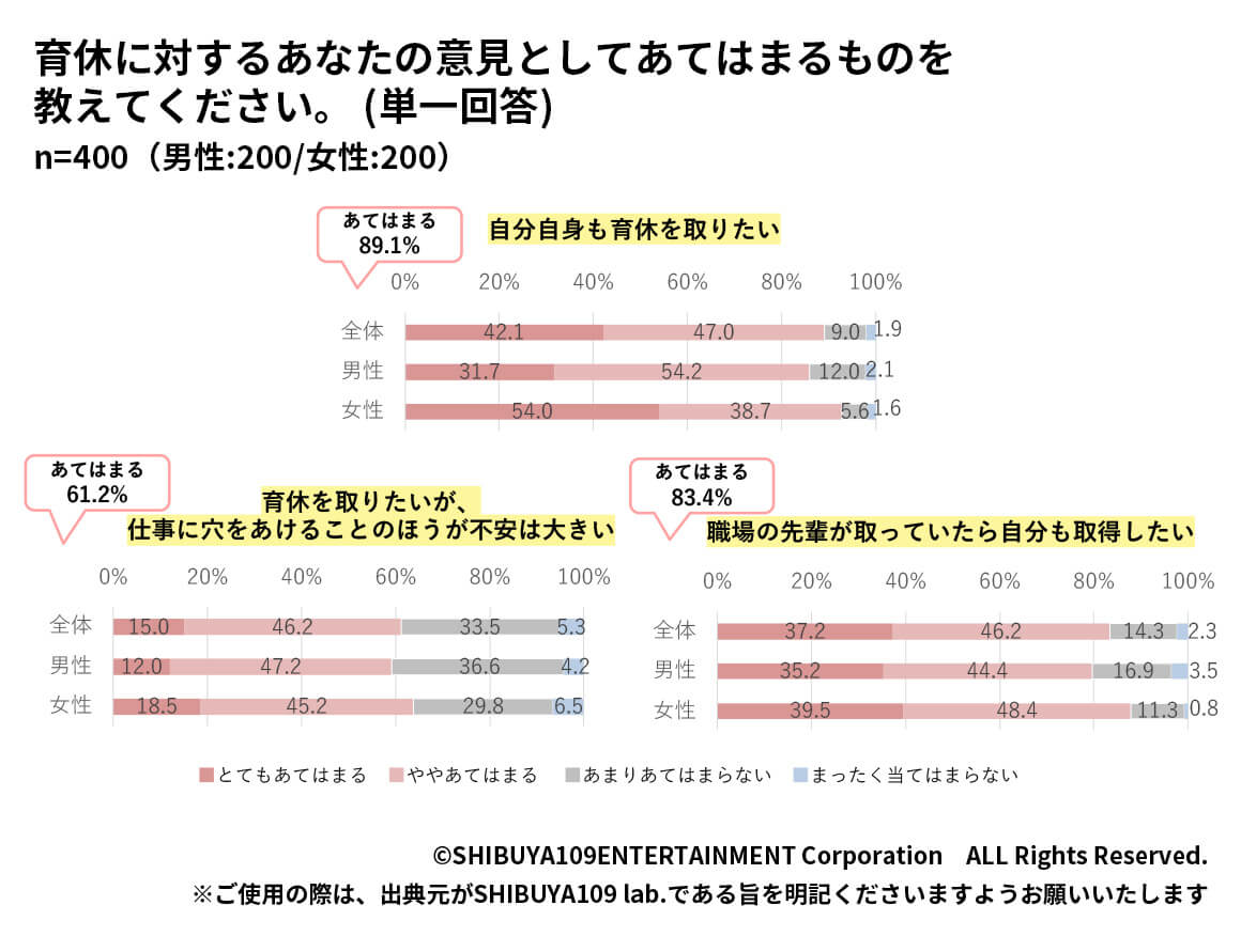 一方で、子育てについて自分自身も育休を取りたいと考えたZ世代は女性で92.7%、男性で85.9%となりました。「育休を取りたいが仕事に穴をあけることのほうが不安は大きい」と回答したのは61.2%、「職場の先輩が取っていなくても取得したい」と回答したのは77.8%となりました。2022年に男性育休に関する法改正も行われましたが、法制度だけではなく若者の価値観としても、男性の育休取得に対する意欲が根付いていることがわかります。
