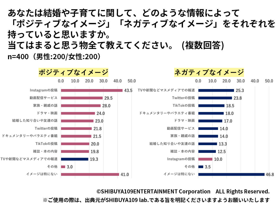 最後に、結婚や子育てに関して、どのような情報によって「ポジティブ・ネガティブなイメージ」をそれぞれ持っていると思うか、メディアごとに見たところ、それぞれ真逆のメディアが該当し、ポジティブなイメージは「Instagramの投稿」(43.5%)や「動画配信サービスの動画」(29.5%)、ネガティブなイメージは「TVや新聞などのマスメディアの報道」(25.3%)、「Twitter」(23.8%)から取得していることがわかります。