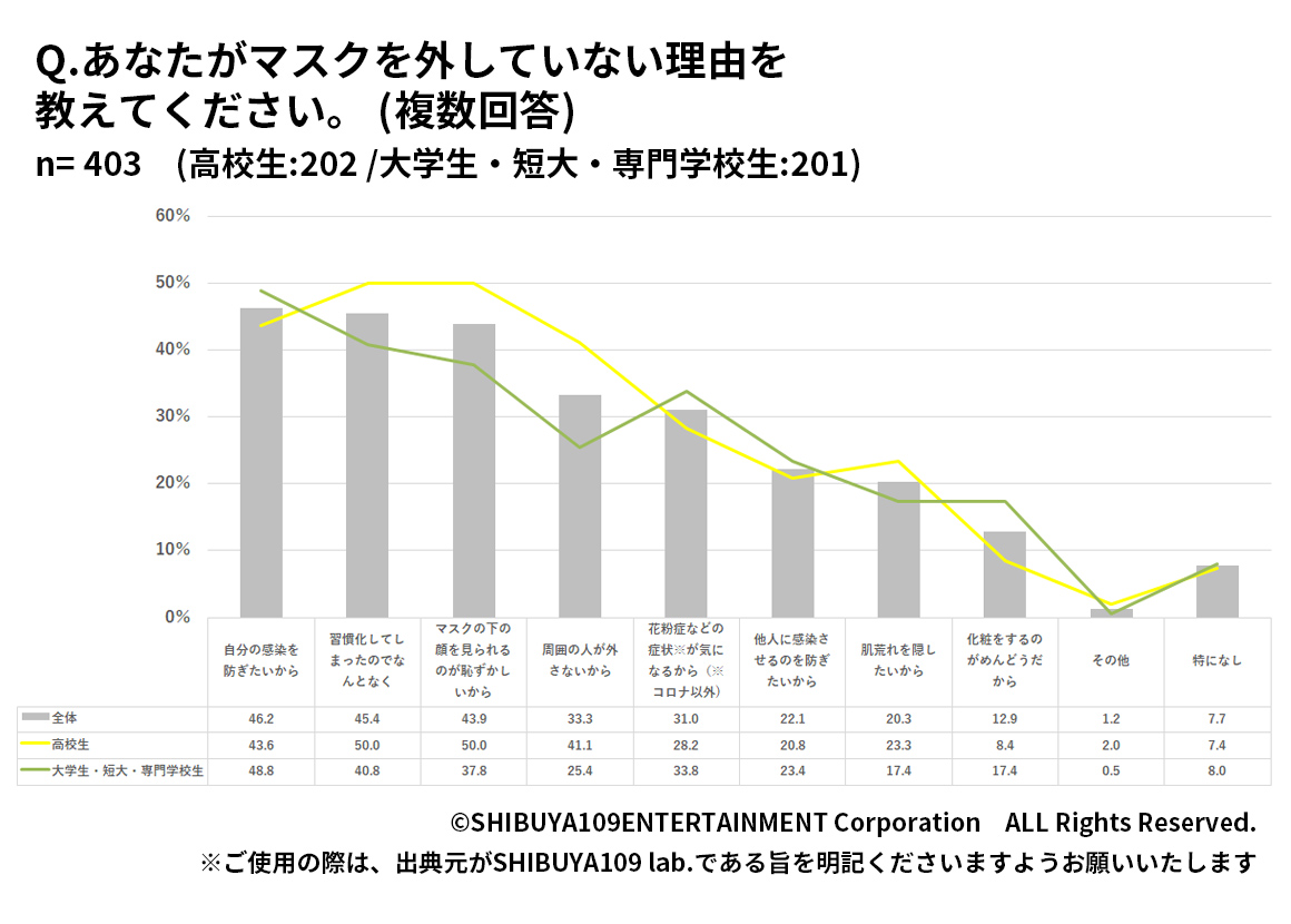 今回の調査では、コロナ禍前後で変わりゆくZ世代の美容に関する価値観を調査しました。まず初めにマスクの着用状況※図1について聞いてみると、「状況に合わせて外している(着けている事が多い)(39.0%)」「常に外していない(34.2%)」を合計した73.2%の若者がいまだマスクを着用している時間が長い生活を送っていることがわかります。(2023年4月現在)マスクを外していない理由を聞いてみると、全体では「自分の感染を防ぎたい(46.2%)」「習慣化してしまったのでなんとなく(45.4%)」「マスクの下の顔を見られるのが恥ずかしい(43.9%)」が上位の理由として挙がりました。周囲からの同調圧力というよりは、単に感染対策や自分の判断でマスクを外していないことがわかります。ただし回答者を大学生と高校生で分け、高校生だけを抽出してみると、上位3つの内容は変わらないものの、「周囲の人が外さない(41.1%)」も回答数が多くなっており、大学生に比べ、学校など特定のコミュニティで過ごしている高校生のほうが周囲の目を気にしていることがわかりました。