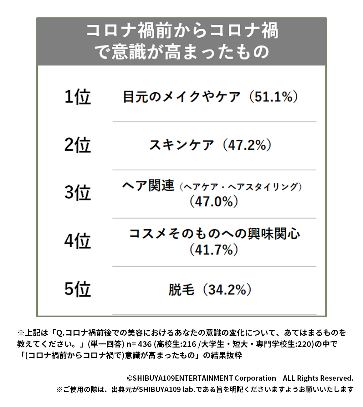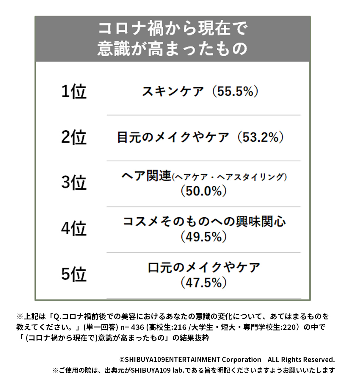 今年の4月にはマスクの着用状況も変わりましたが、コロナ禍の前後でZ世代の美容に関する意識はどのように変化したのでしょうか。その他、今までもSHIBUYA109 lab.のトレンド大賞にノミネートしてきた診断系コンテンツへの本音や、Z世代の思う「なりたい自分」についても調べてみました。