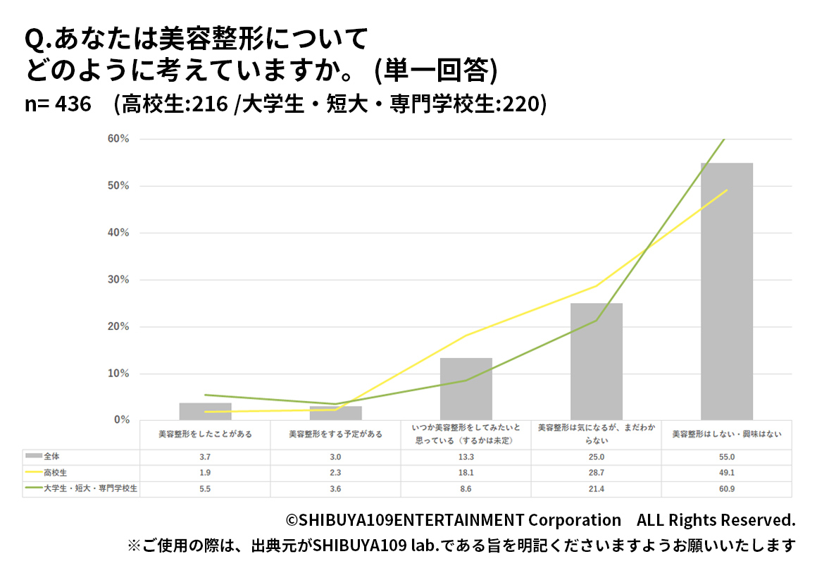 最後に美容整形について、「美容整形をしたことがある(予定がある)・興味がある」層は45.0%、「美容整形はしない・興味はない」55.0%となり、整形への興味は大きく半数に分かれているようです。