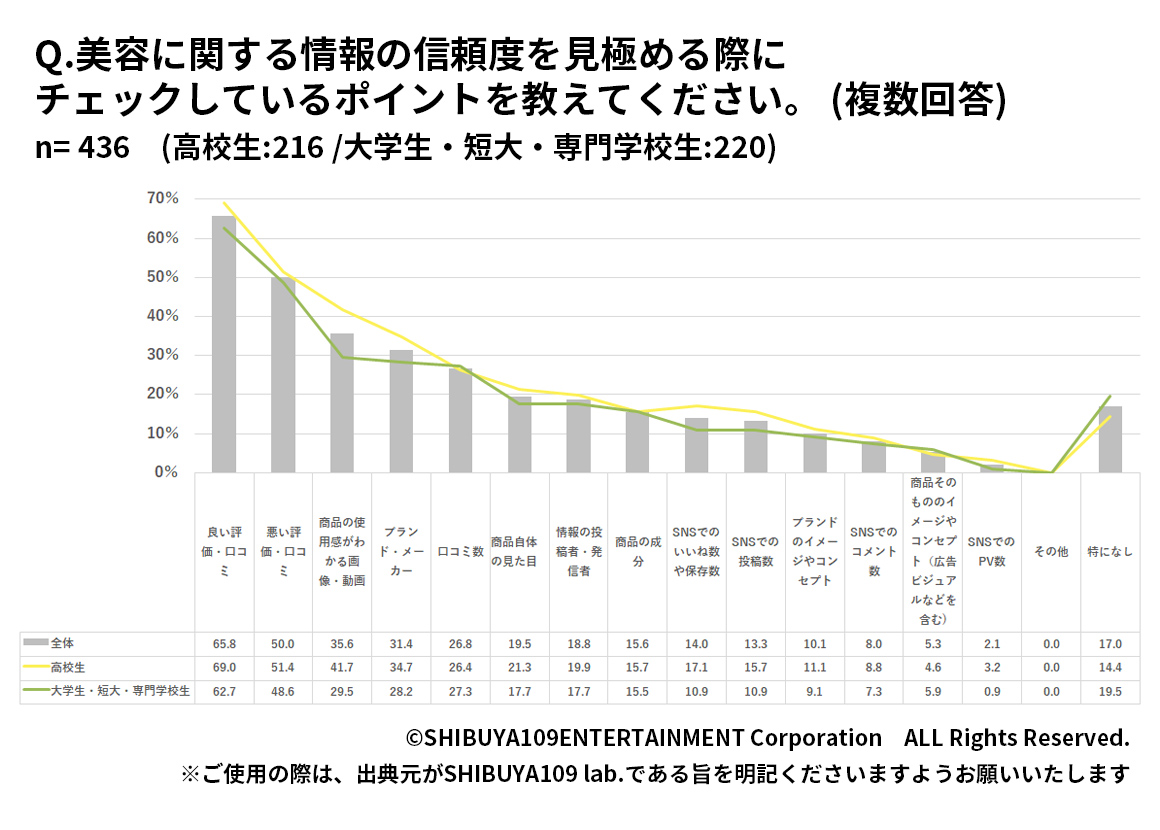 グループインタビューでは、「フォロワーが多い人の投稿は信用しているし、紹介している商品の容量が減っていると本当に使っているんだと思えて信用できる。(高校2年生)」「話が面白くて、説明もわかりやすいインフルエンサーが好き(高校2年生)」「PR投稿はしませんと明言してくれているインフルエンサーは信用している(高校3年生)」「私の好きなインフルエンサーは、説明が論理的だし、メイクを研究してきたことが伝わるので信用している(大学3年生)」「インフルエンサーたちの商品説明が似通っているとPRを疑う。PRだとしても良い商品だと思ったら店舗で確認して購入している(大学2年生)」という声がありました。