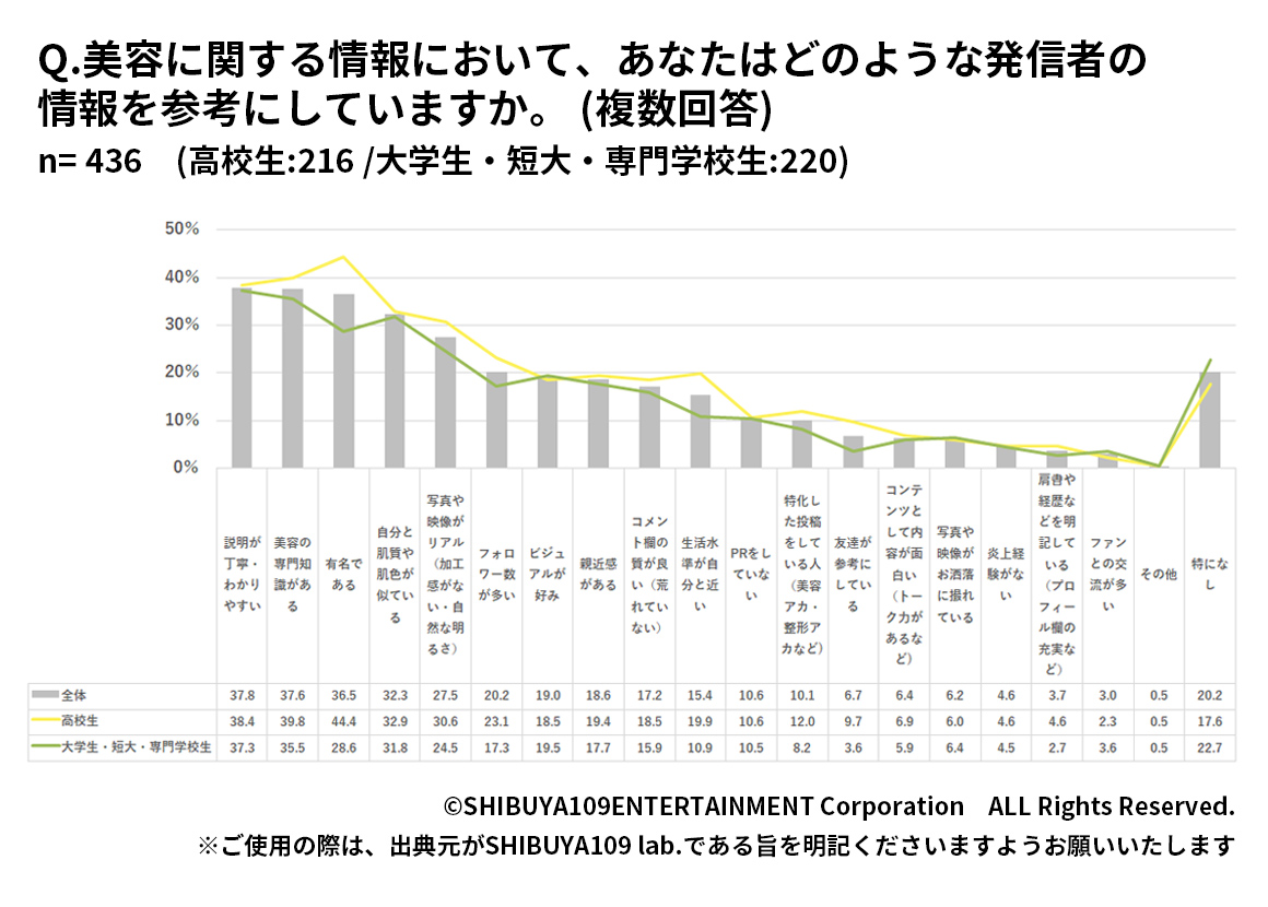 美容情報について「あなたはどのような発信者の情報を参考にしていますか」という質問では、「説明が丁寧・わかりやすい(37.8%)」「美容の専門知識がある(37.6%)」「有名である(36.5%)」「自分と肌質や肌色が似ている(32.3%)」「写真や映像がリアル(加工感が無い・自然な明るさ)(27.5%)」が上位となりました。