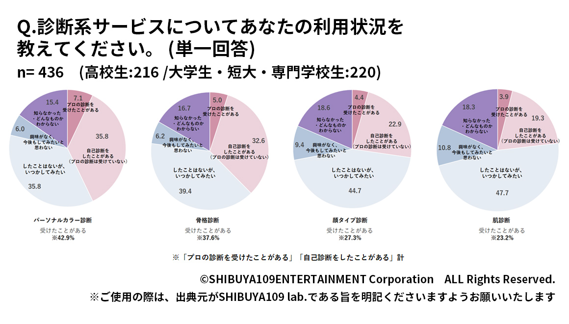 次に、SHIBUYA109 lab.のトレンド大賞でも数年取り上げている「診断コンテンツ」について聞きました。様々な診断(パーソナルカラー診断、骨格診断、顔タイプ診断、肌診断)について、どの診断についても、「診断を受けたことがあるまたは興味がある」層は7〜8割にのぼり、実際に「診断をした」層も2〜4割存在していることがわかりました。