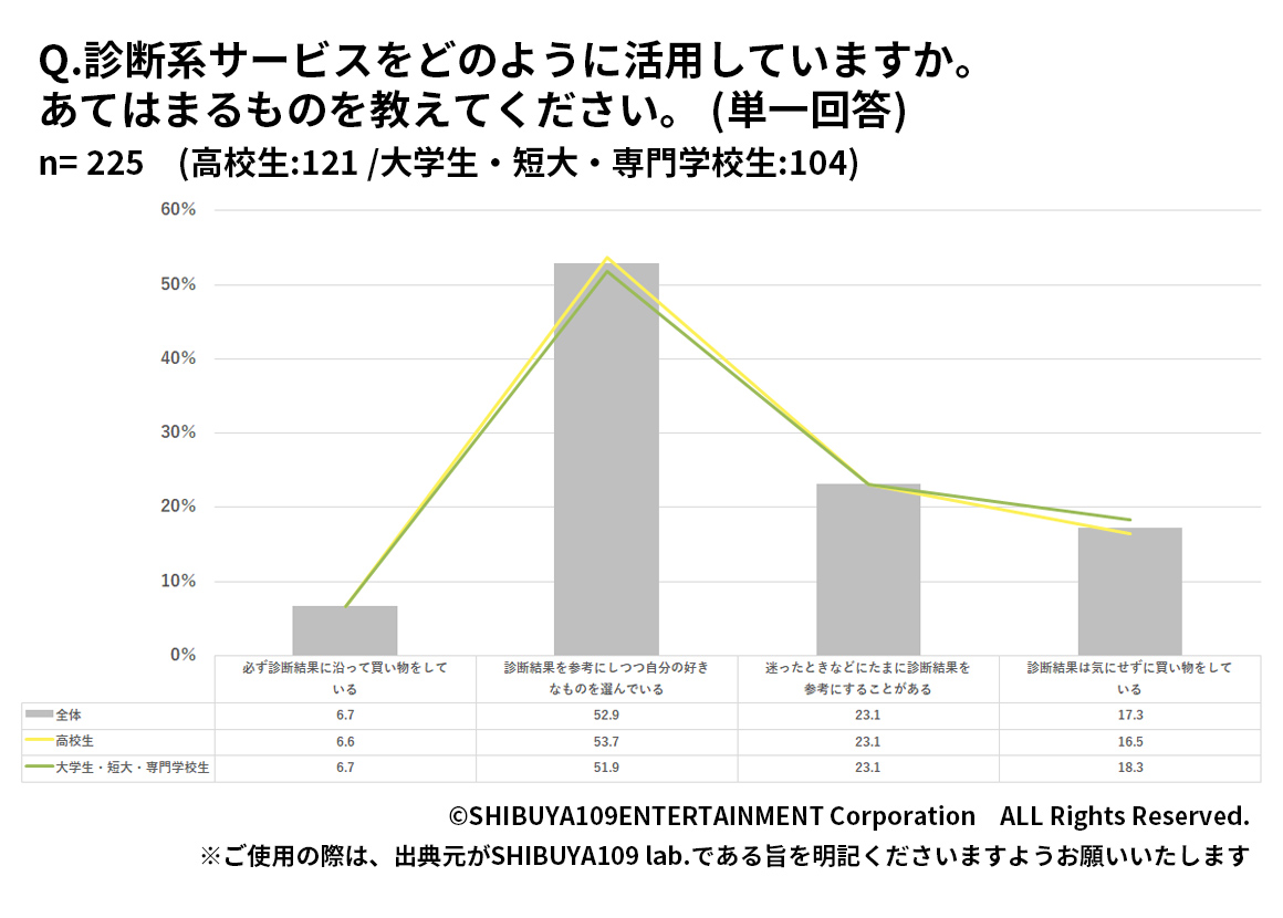 グループインタビューでも、「もともと自分の好みと診断で似合うと言われていたものが一緒だった。自分が似合わないものの理由がわかったし、コスメを購入する際の選択肢が絞られて選びやすくなった(高校3年生)」「コスメアイテムに自分のパーソナルカラーに似合うと書いてあると試したくなる(高校3年生)」「自分で似合うものは自分で探したい。診断はそのためのサポート(大学3年生)」「店員さんに診断を参考に商品を勧められると『自分で(似合うかは)決めるから』と思う。自分で似合うものを研究しているので、型にはめすぎずに考えたい(大学2年生)」「自分の好きなものは変えたくない。好きなものを身につけているほうが(毎日を)楽しめる(高校3年生)」という回答が聞かれており、診断結果を参考にするものの、うまくその結果と付き合いながら自分の意志で似合う美容アイテムを見つけていることがわかります。