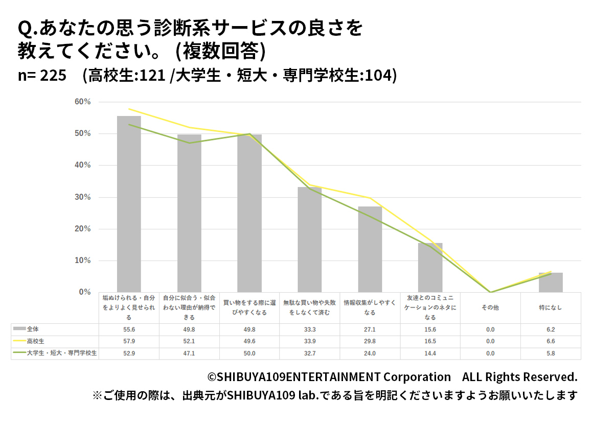 診断の活用方法を聞いてみると、「診断結果を参考にしつつ自分の好きなものを選んでいる」が52.9%となり、圧倒的に多くなりました。診断サービスの良さとして「垢抜けられる・自分をよりよく見せられる(55.6%)」「自分に似合う・似合わない理由が納得できる(49.8%)」「買い物をする際に選びやすくなる(49.8%)」が上位になりました。