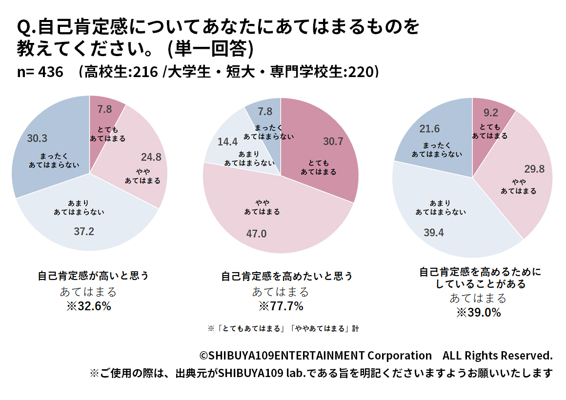 「自己肯定感が高いと思う」という質問についても「あてはまらない」が67.5%となっています。「自己肯定感を高めたい」かという質問に対しては、「あてはまる」が77.7%となりましたが、「自己肯定感を高めるためにしていることがある」という質問に「あてはまる」と回答したのは39.0%となり、半数以上が具体的に自己肯定感を高めるための行動をしていないことがわかります。