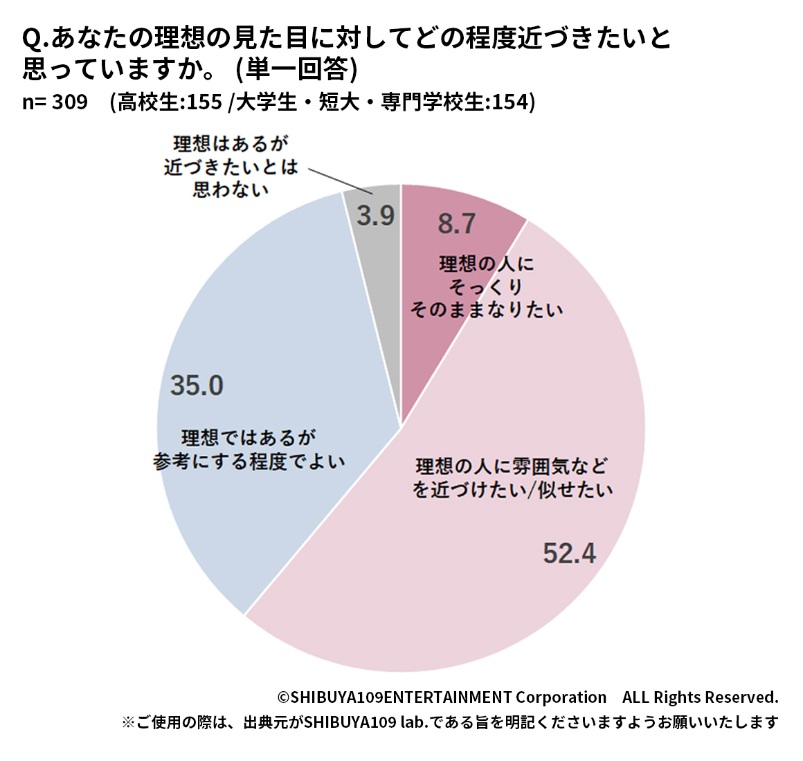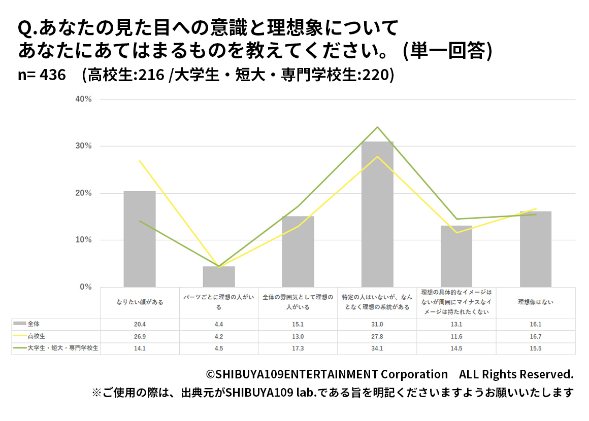 一方で、見た目の理想について最も回答が多かったのが「特定の人はいないが、なんとなく理想の系統がある」で31.0%であり、「なりたい顔がある」と回答したのが20.4%でした。特定の誰かではなくぼんやりとした好みの系統に対して、アプローチしていることがわかります。