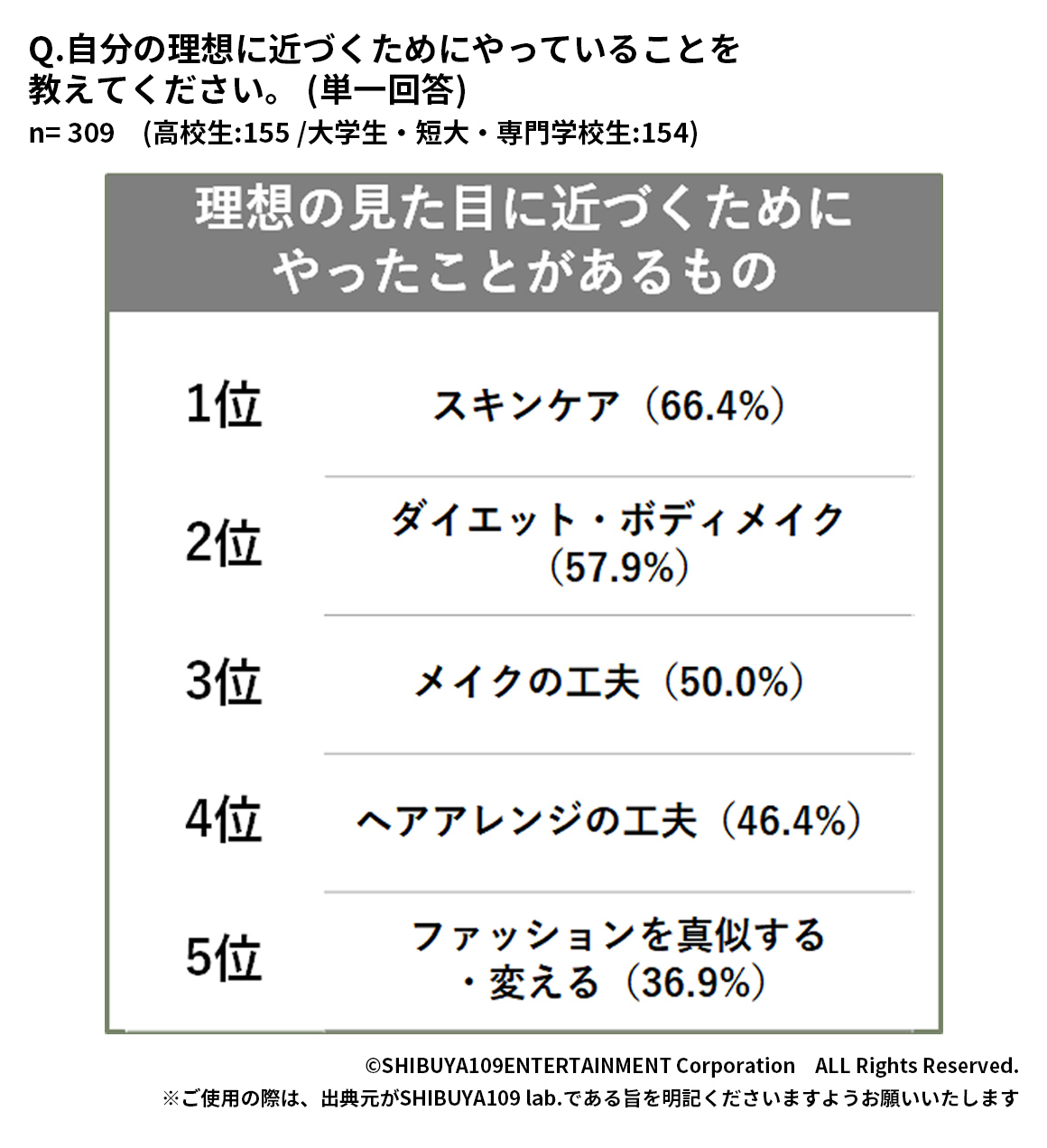 さらに、理想に近づくためにやっていることを聞いてみると「スキンケア(66.4%)」「ダイエット・ボディメイク(57.9%)」「メイクの工夫(50.0%)」「ヘアアレンジの工夫(46.4%)」「ファッションを真似する・変える(36.9%)」が上位に上がっています。実際にグループインタビューでも、「理想の顔の女優はメイクも薄いため、メイクでは近づけない。それよりも顔痩せするために塩分を避けるなど、日々の生活から近づけていく。(高校3年生)」「憧れの顔に近づけると評判のカラコンを買ってみたが、自分には似合わなかったので使っていない(大学3年生)」「昔は憧れの人のスタイルブックなどを買って研究していたが、今は、自分は自分であって他人と比べるものではないと思い始めた(大学3年生)」などの回答が聞かれ、メイクで顔などを近づけるよりも、肌や体型の管理などの基本的な部分を見直すことによって、理想に近づこうとしていることがわかりました。