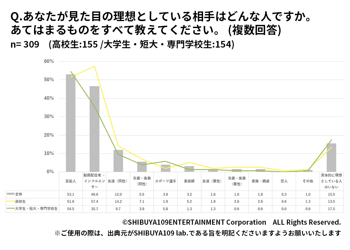 最後に理想の見た目としている相手は、高校生では「動画配信者・インフルエンサー(57.4%)」「芸能人(51.6%)」の回答が多く、大学生では、同じく両者が多いものの「芸能人」が54.5%、「動画配信者・インフルエンサー」が35.7%と大きく差が生まれています。