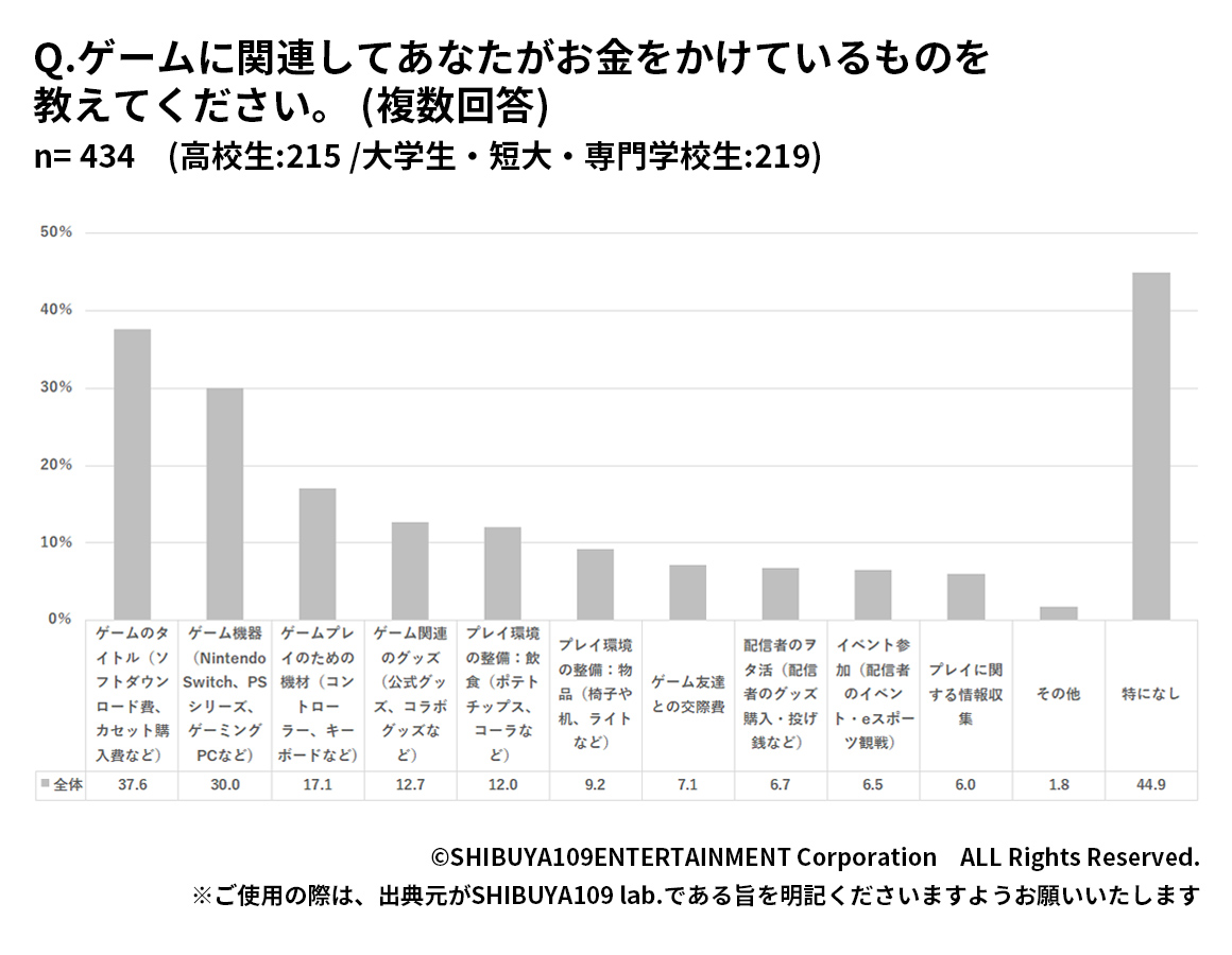 特にお金をかけているものとして多かったのは「ゲームのタイトル(ソフトのダウンロード費、購入費など)(37.6%)」「ゲーム機器(30.0%)」「ゲームプレイのための機材(コントローラー、キーボードなど)(17.1%)」となっています。
