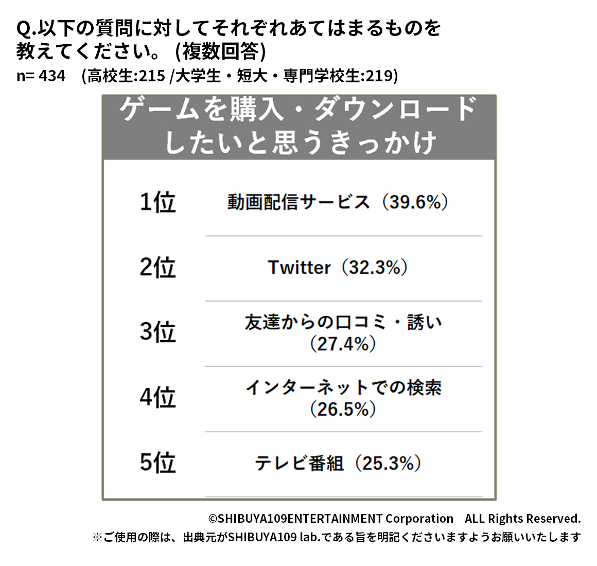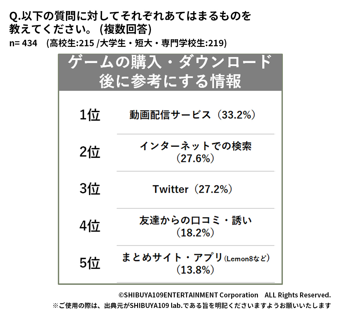 ゲームを購入・ダウンロードしたいと思うきっかけは、「動画配信サービス(39.6%)」「Twitter(32.3%)」「友達からの口コミ・誘い(27.4%)」となっており、上位はSNSが占めるものの、これまでのSHIBUYA109 lab.の様々な消費カテゴリにおける調査で情報源として上位に入っていたInstagramは入らず、趣味ごとに活用されているメディアが違うことがわかります。また、ゲームの購入・ダウンロード後に参考にする情報としても「動画配信サービス(33.2%)」「インターネットでの検索(27.6%)」「Twitter(27.2%)」という回答となりました。
