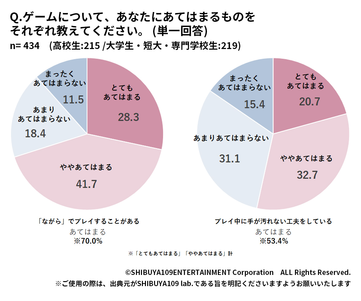 グループインタビューでも、「常に寝転がりつつ、ながらプレイでゲームをしていて、アニメやドラマを見たり、ゲームのプレイ動画を見たりしながら遊んでいる。集中してゲームはしない」「ゲームをしながら動画配信サービスの動画を見ている。基本的にお菓子は箸で食べる」「通学中や授業と授業の空き時間にプレイする」といった「ながらプレイ」の話があった一方で「ストロータイプの飲み物を用意して連続でのプレイ中にも水分補給ができる工夫や、手が汚れないお菓子を準備している」「プレイを始めたら部屋から出られないので、事前にトイレにいったり食料を用意したりしている」など、集中してゲームを行うために工夫している姿も垣間見え、ゲームタイトルや状況により、「ながら」と「集中」を使い分けながら、日常の様々な場面でゲームを楽しんでいることがわかりました。