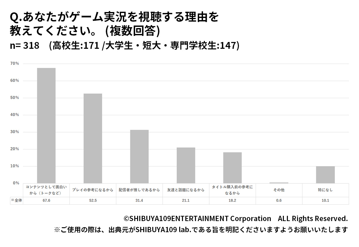さらに「ゲーム実況を視聴したことがある」という質問に対しては、73.3%が視聴経験があり、「持っていないゲームの実況を視聴したことがある」という回答も70.5%となっていることから、動画コンテンツのジャンルとしてゲーム実況が浸透していることがわかります。実際にゲーム実況を見る理由も聞いてみると「コンテンツとして面白いから」が67.6%で最も多くなりました。