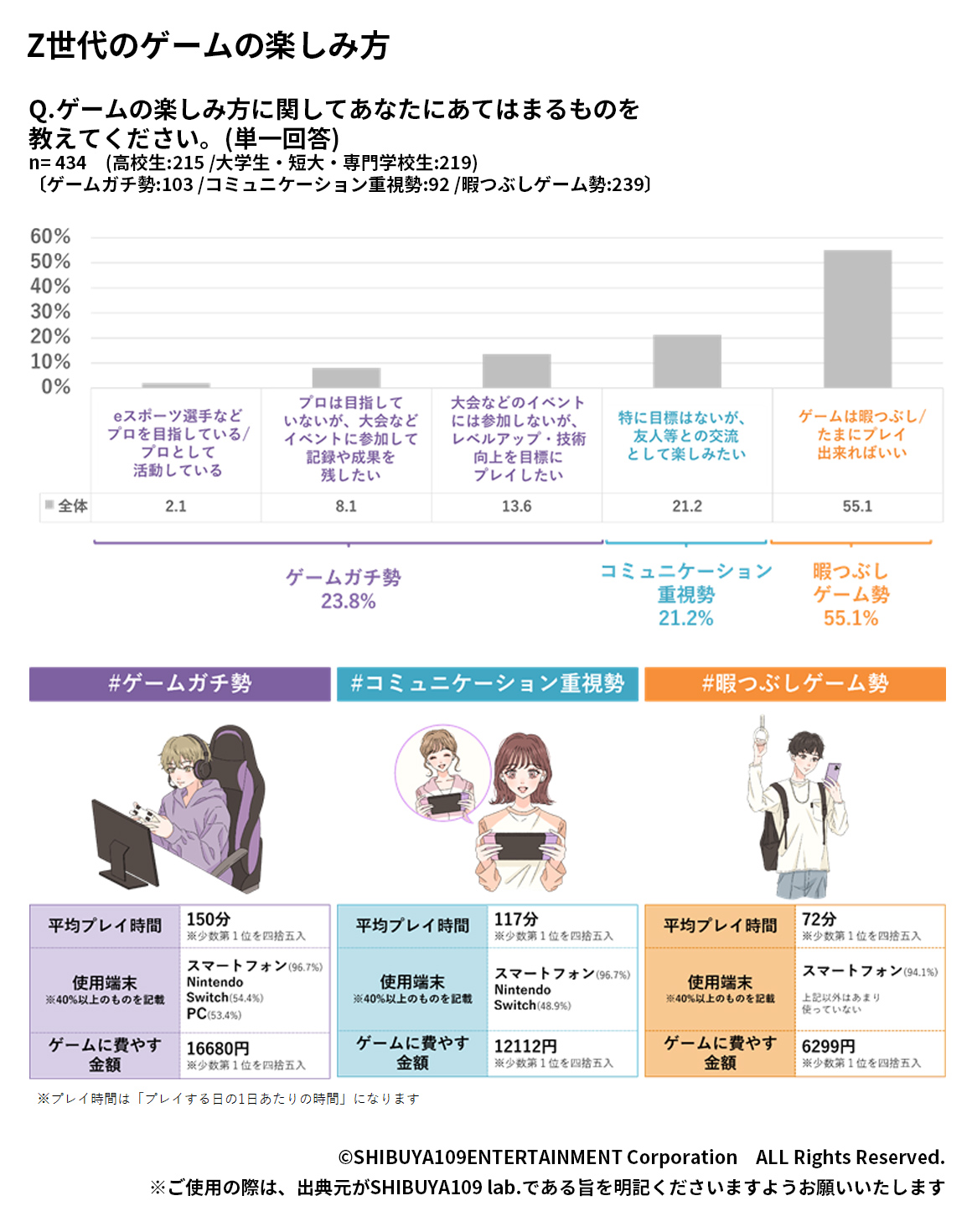 「ゲームの楽しみ方」を聞いた設問で、「ゲームガチ勢」は「eスポーツ選手などプロを目指している/プロとして活動している(2.1%)」「プロは目指していないが、大会などイベントに参加して記録や成果を残したい(8.1%) 」「大会などのイベントには参加しないが、レベルアップ・技術向上を目標にプレイしたい(13.6%) 」という回答者(計23.8%)、「コミュニケーション重視勢」は「特に目標はないが、友人等との交流として楽しみたい(21.2%)」という回答者、「暇つぶしゲーム勢」は「ゲームは暇つぶし/たまにプレイ出来ればいい(55.1%)」という回答者で構成しており、それぞれ平均時間や使用端末、費やす金額などが異なります。