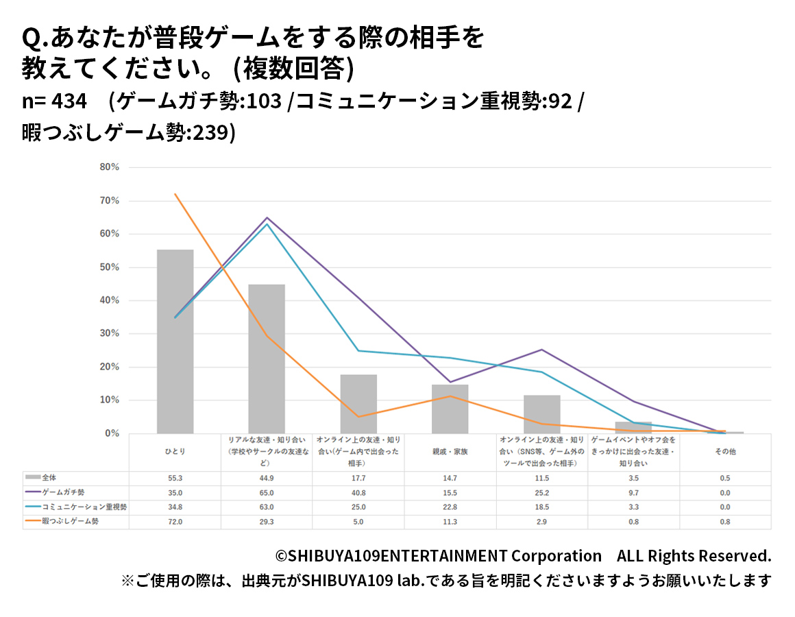 普段ゲームをする相手を見てみると、「暇つぶしゲーム勢」では「ひとり(72.0%)」の回答が圧倒的に多かったのに対し、「ゲームガチ勢」は「リアルな友達・知り合い」が65.0%、「オンライン上の友達・知り合い(ゲーム内で出会った相手)」が40.8%、「コミュニケーション重視勢」も「リアルな友達・知り合い」が63.0%で多くなりました。