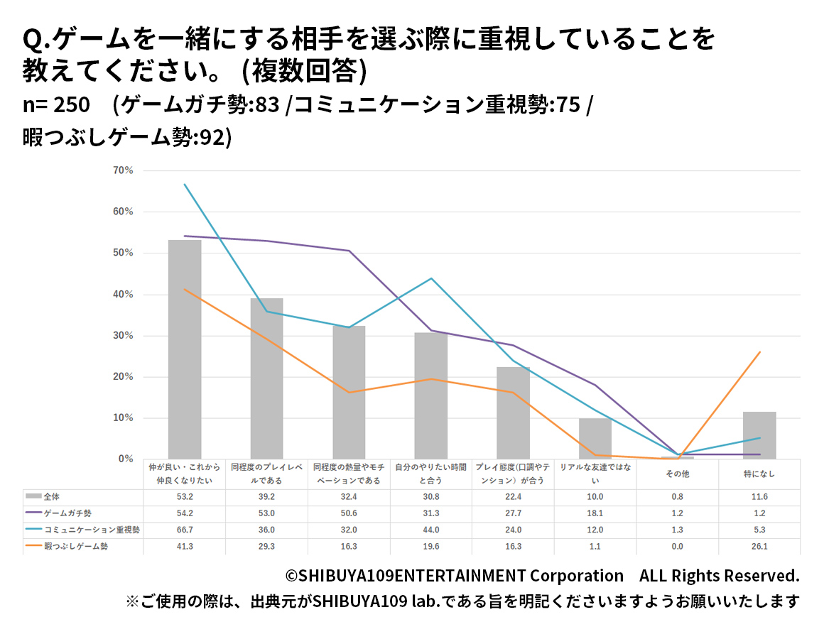 実際に、ゲームを一緒にする相手を選ぶ際に重視していることを聞いてみると、いずれの属性でも「仲がいい・これから仲良くなりたい」ことが最も割合としては高くなり、全体では53.2%と半数以上が重視していることがわかりました。「コミュニケーション重視勢」では、「仲がいい・これから仲良くなりたい(66.7%)」の次に、「自分のやりたい時間と合う(44.0%)」が重視されています。一方、唯一「ゲームガチ勢」のみ、「仲がいい・これから仲良くなりたい(54.2%)」の他、「同程度のプレイレベルである(53.0%)」、「同程度の熱量やモチベーションである(50.6%)」と、技術やゲームへの熱量も同等に重視することがわかっています。