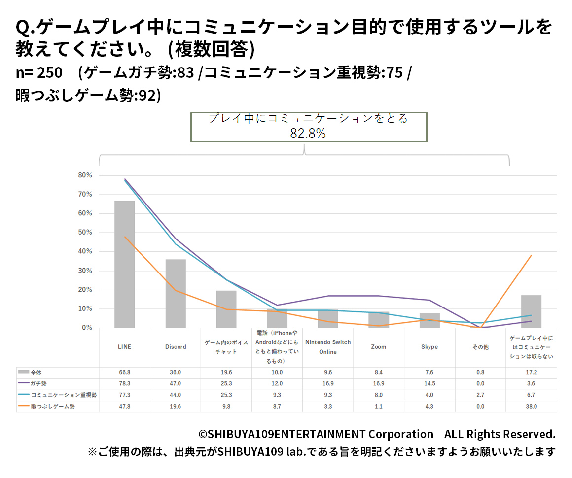 また、昔は誰かの家に集まって大人数で遊ぶスタイルが定番だったゲームは、コミュニケーションツールを使って、お互いの家から通話しながら遊ぶスタイルへと変化しています。他人とゲームをプレイしている回答者のうち、ゲーム中に何らかのコミュニケーションをとっているのは82.8%、中でも「LINE(66.8%)」「Discord(36.0%)」「ゲーム内のボイスチャット(19.6%)」がよく利用されています。