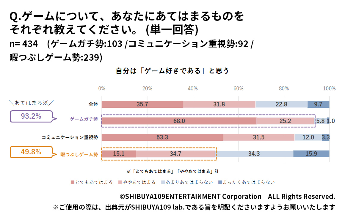 さらに、「ゲーム好き」について、自分がゲーム好きであると認識しているのは全体では67.5%でしたが、「ゲームガチ勢」は93.2%、「暇つぶしゲーム勢」は49.8%と大きく差がありました。