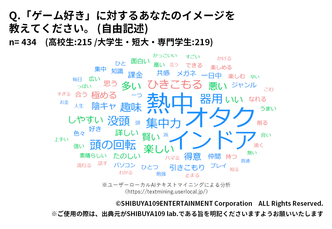 ゲーム好きの印象をグループインタビューで聞いてみると、「周りにもゲームを楽しんでいる人が多いし、色々な人がいるので(ゲーム好きの印象を)ひとくくりにするのが難しいと思う。」「強いて言うなら、色々なゲームタイトルを幅広くやっている人がゲーム好き。一つのゲームをやり込む人は、そのタイトルが好きな人」「ゲーム好きは、暇があればゲームをやる人。薦めれば、どんなジャンルもやってくれる人。自分は勝ちにこだわらずにゲームを楽しんでいるだけなのでゲーム好きではない」といった声がありました。さらに「ゲームは操作がものすごく難しいし、作戦を練ることも必要なので、頭の回転が速い印象。」と、全体的にポジティブな印象をいだいていることが見受けられました。またゲーム非ユーザーも含めた「ゲーム好き」に対するイメージを自由記述回答したテキストマイニングでも、そういったポジティブなワードも含まれていました。