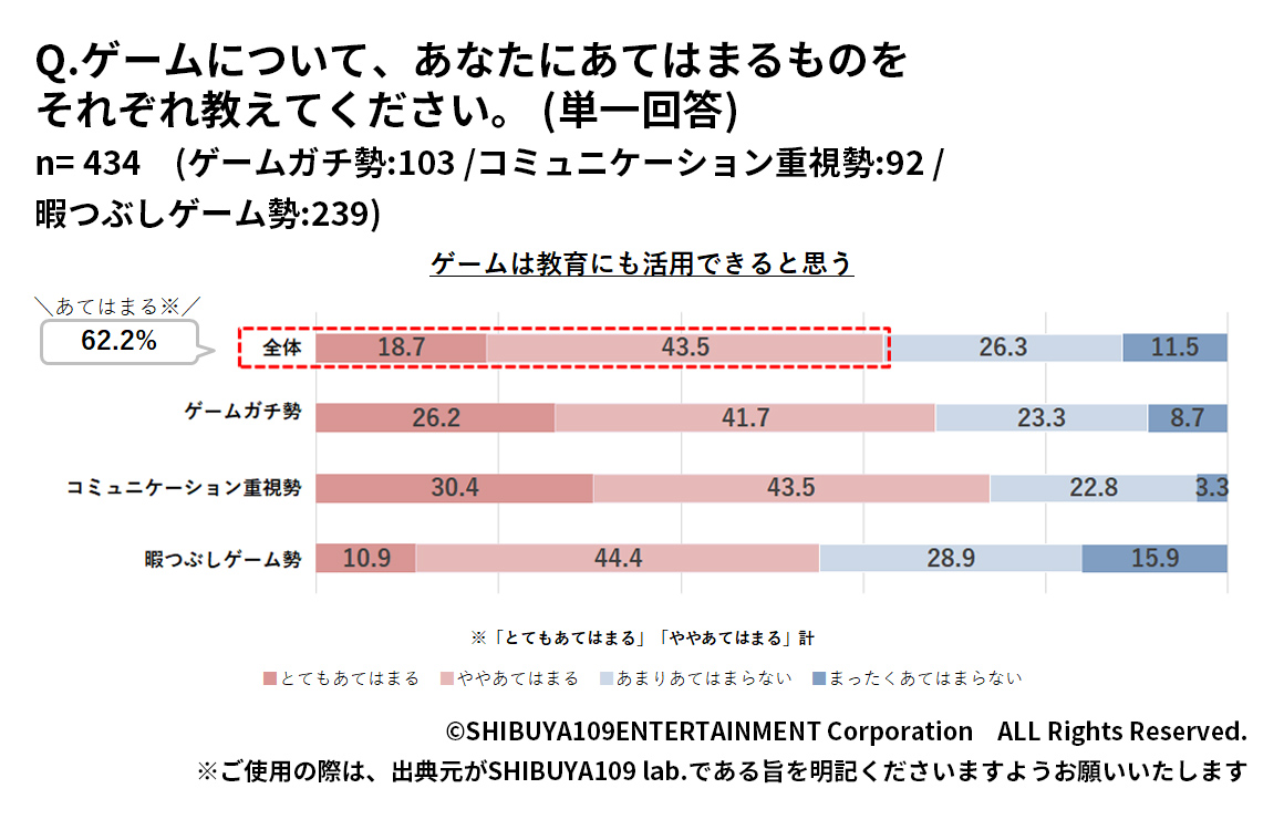 実際に、「ゲームは教育にも活用できると思う」と回答したのは62.2%となり、グループインタビューでも、「例えばMinecraftは、自分でゼロから何かを考えてつくるので、教育にも良さそう」というコメントがありました。