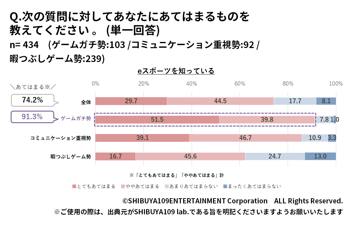 「ゲームガチ勢」は、ゲームについての熱量が高く、「ゲーム内で課金したことがある」と回答したのは、全体では42.6%となったのに対し、「ゲームガチ勢」は74.8%となっています。「eスポーツ」を知っているかどうか聞いた質問では、全体では認知度が74.2%だったのに対し、「ゲームガチ勢」は91.3%になりました。