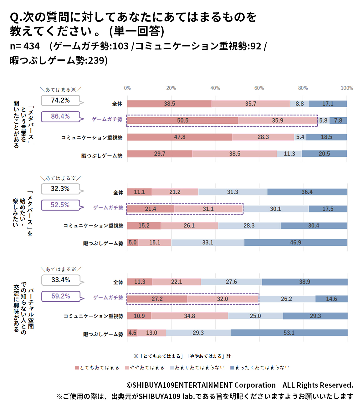 「メタバース」という言葉の認知度は全体が74.2%、「ゲームガチ勢」は86.4%となりました。メタバースを始めたい、または楽しみたいかという質問でも、全体が32.3%に対し、「ゲームガチ勢」は52.5%と半数以上が興味を示しており、バーチャル空間での知らない人との交流に関しても、全体では33.4%が興味を示したのに対し、「ゲームガチ勢」は59.2%と高い割合で興味をいだいていることがわかりました。