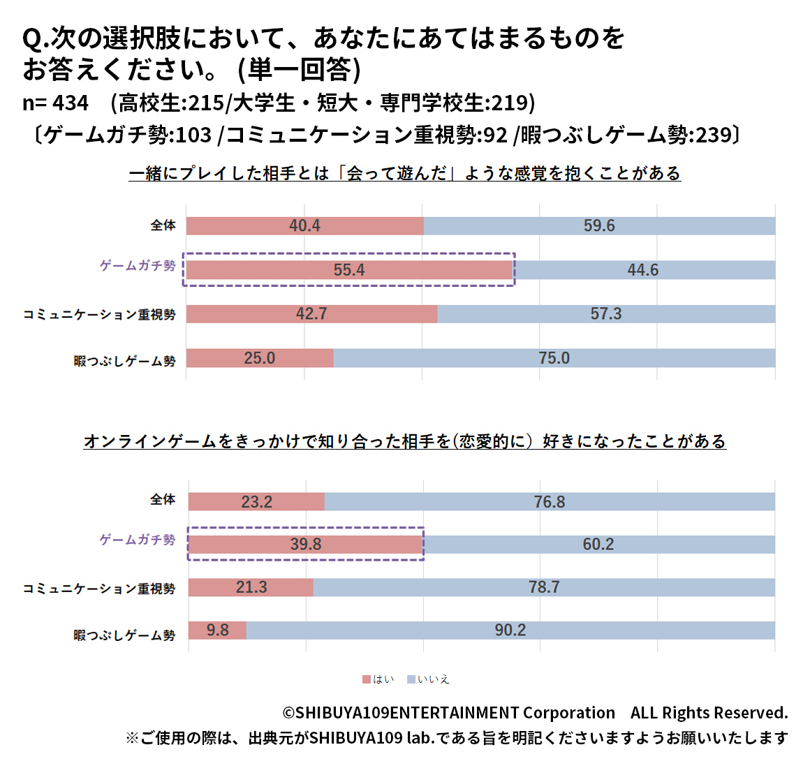 また、「一緒にプレイした相手とは会って遊んだような感覚を抱くことがある」と回答したのは、全体では40.4%となりましたが、「ゲームガチ勢」は55.4%と少し高い割合となりました。オンラインゲームきっかけで知り合った相手を(恋愛的に)好きになったことがあるかどうか聞いてみると、全体では23.2%が「はい」と回答した一方、「ゲームガチ勢」は、39.8%が「はい」と回答しています。ゲームに対して熱心な層ではオンラインでの交流が、実際のオフラインでの人間関係に深く影響していることがわかります。