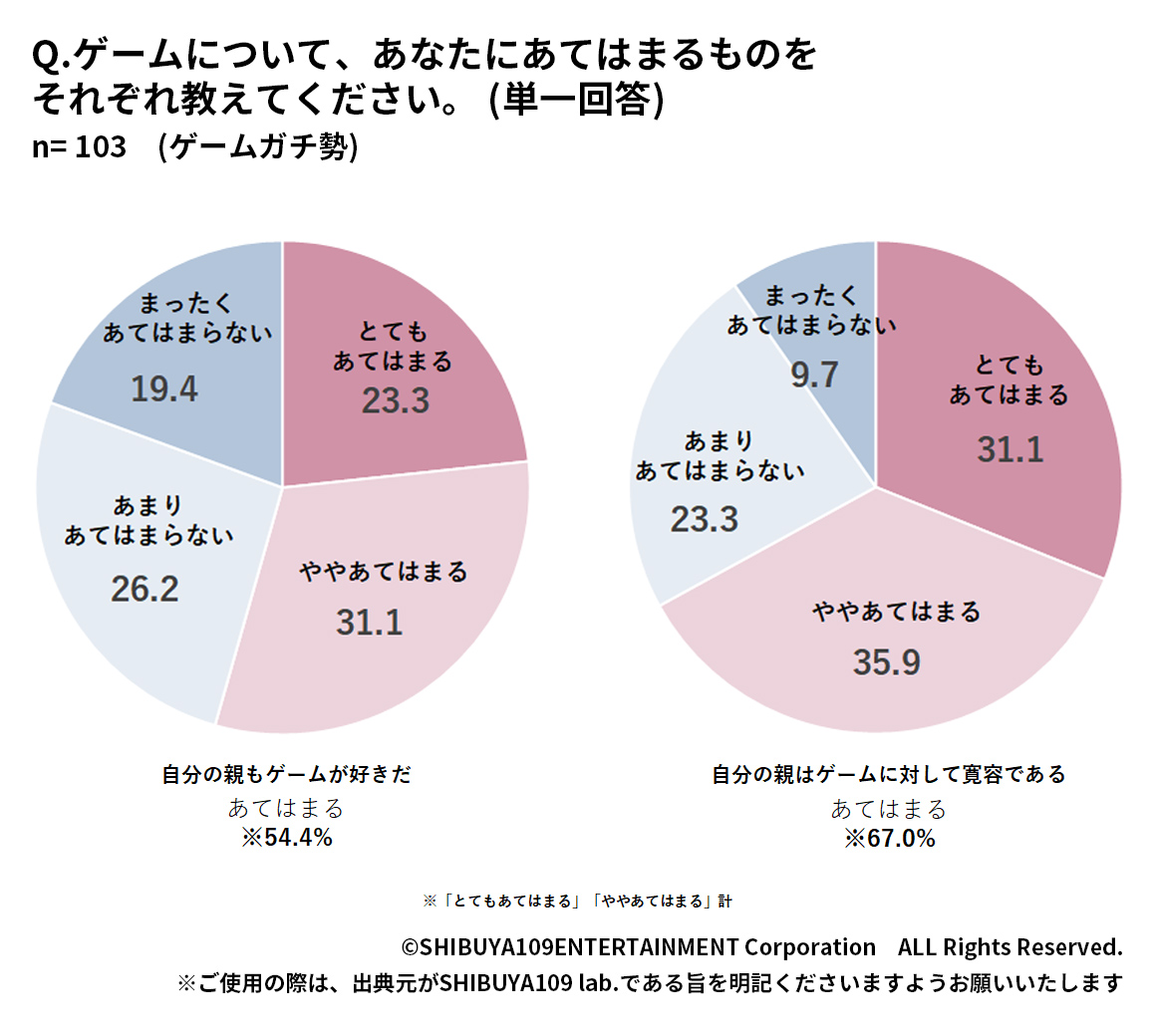 最後に、家庭環境を見てみると、ゲームガチ勢の場合は「自分の親もゲームが好きだ」と回答したのは、54.4%となり、約半数以上となっています。さらに「自分の親はゲームに対して寛容である」という回答は67.0%となり、ゲームに対して前向きな環境がゲームへの熱量の根幹を支えていることも感じられます。