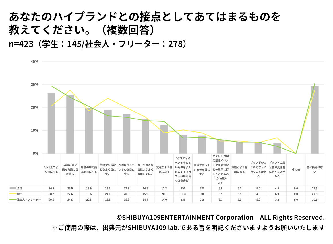 ハイブランドとの接点について聞いてみると「SNS上でよく目にする(26.5%)」「店舗の前を通った際に目にする(25.5%)」「店舗の中で商品を目にする(19.9%)」という回答が多く挙がった一方、最も多い回答は「特に接点はない(29.6%)」になりました。