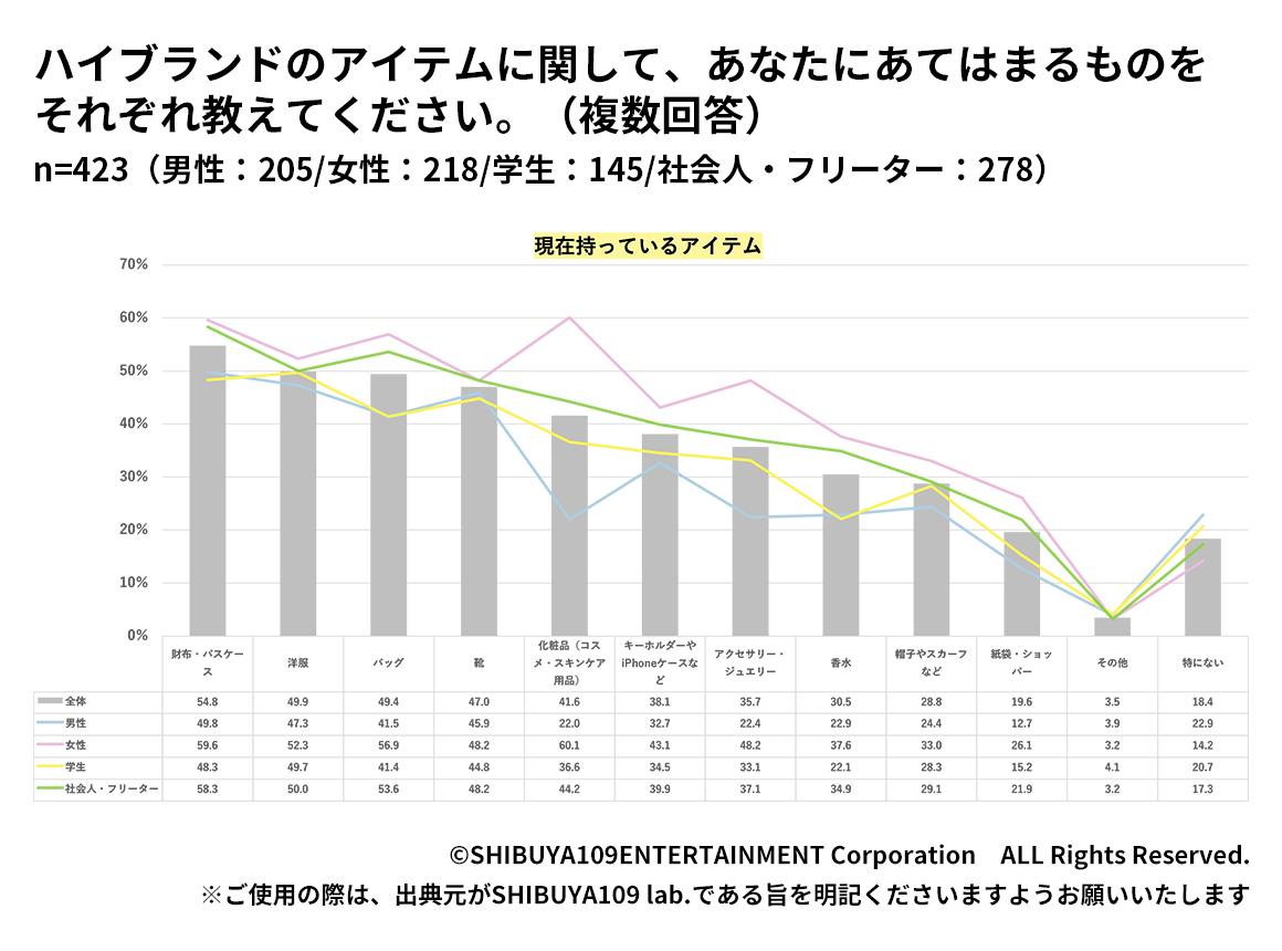 グループインタビューでは、「TikTokやInstagramで、ハイブランドのまとめ投稿(例:財布など)を目にする」「K-POPのアイドルがハイブランドを着ているのを見ると、憧れるしかっこいいと思う」「Instagramや動画配信サービスで好きな人が着ているのを見て、真似したいと思うのが一番多い。あとは渋谷に遊びに来ると店舗に寄って欲しいものに目星をつけておき、後日お金を貯めて買う」などの声が聞かれました。 現在持っているハイブランドのアイテムを聞いてみると、全体では「財布・パスケース(54.8%)」「洋服(49.9%)」「バッグ(49.4%)」が多くなりましたが、女性だけに絞って聞いてみると、「化粧品(60.1%)」「財布・パスケース(59.6%)」「バッグ(56.9%)」と、結果が大きく変わりました。