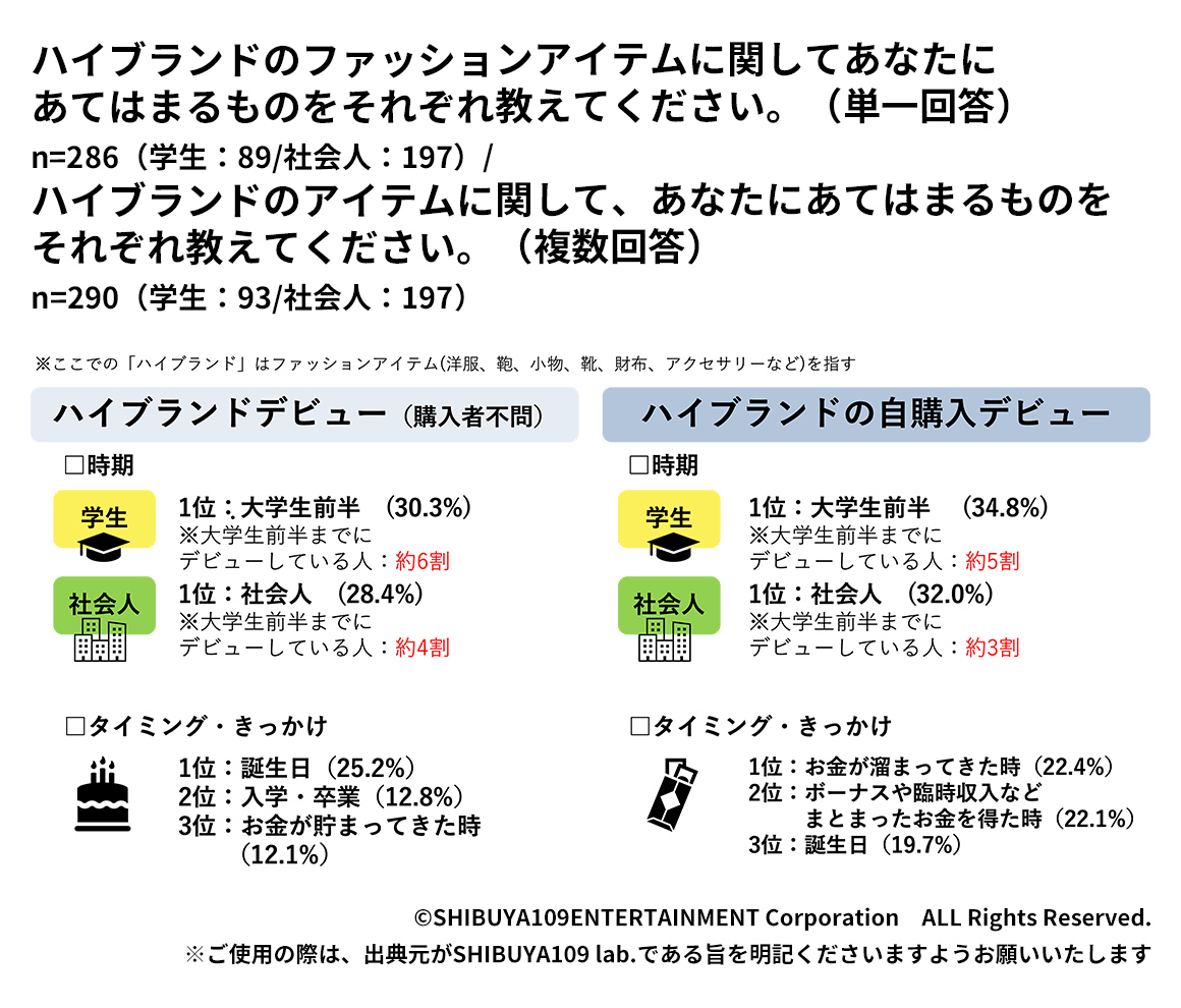 次に、ハイブランドのファッションアイテム(洋服、鞄、小物、靴、財布、アクセサリーなど)に関して、利用・着用デビューと自己購入デビューについて調査してみました。ハイブランドのファッションアイテムを初めて着用・利用し始めた時期について、大学生は「大学生前半(1~2年生)(30.3%)」社会人は「社会人(28.4%)」が最も多い回答となりました。さらに、初めて自分のお金でハイブランドのファッションアイテムを購入した時期も聞いてみると、最も多い回答が、大学生は「大学生前半(1~2年生)(34.8%)」となったのに対し、社会人は「社会人(32.0%)」となっており、現役の大学生の方が早い段階でハイブランドのファッションアイテムに触れる傾向があることがわかります。